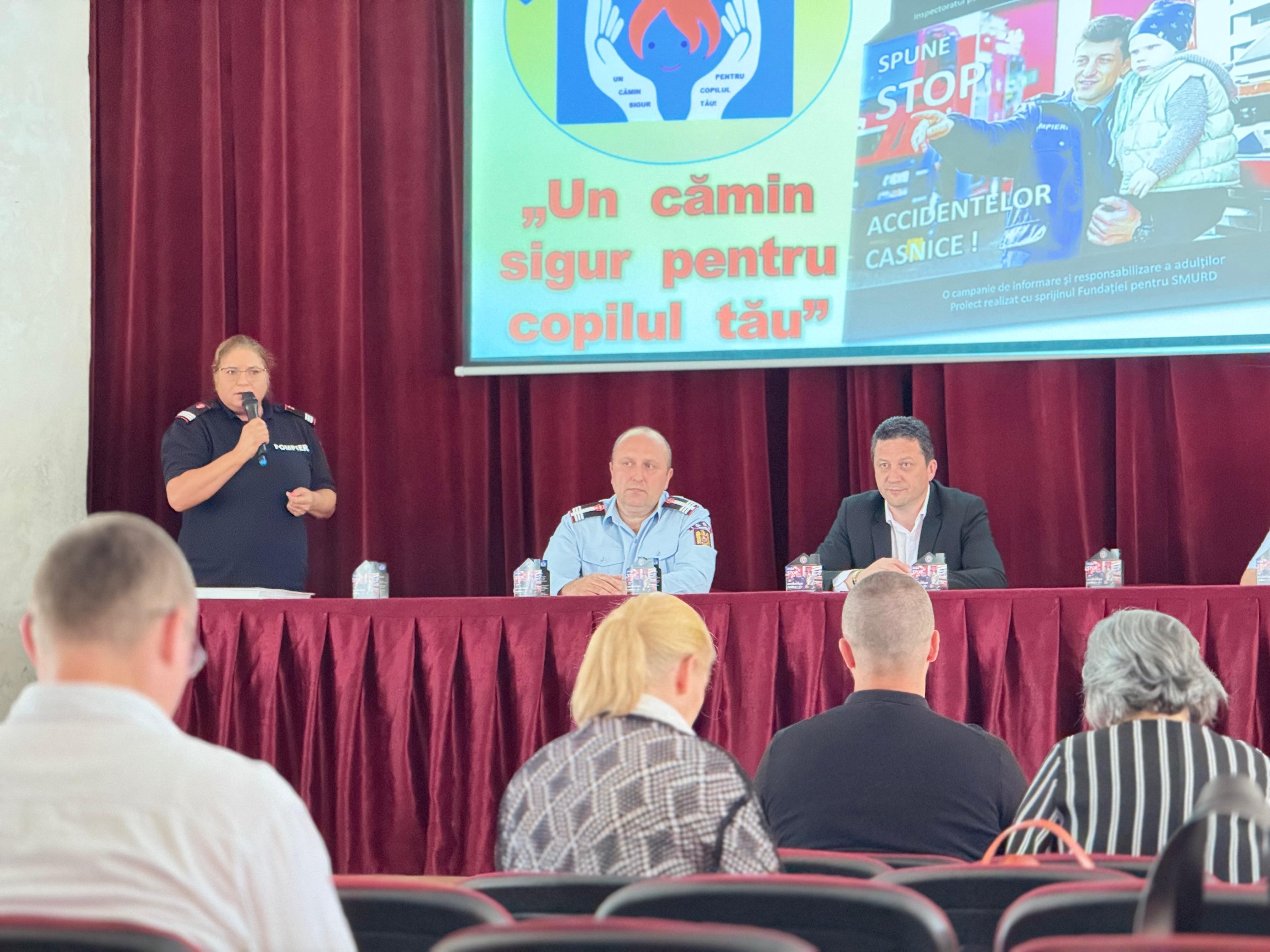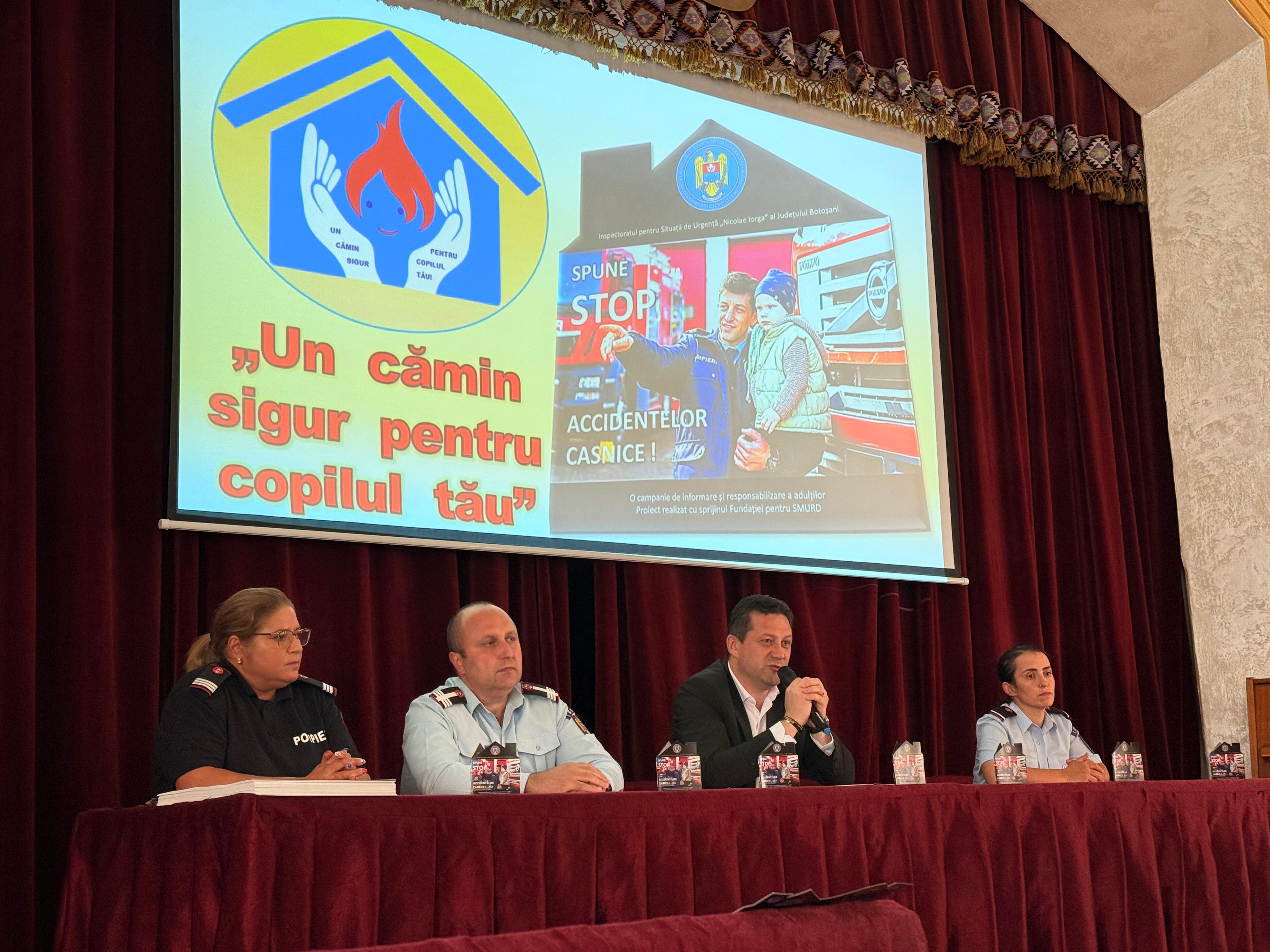 Campania de informare și educare preventivă „Un cămin sigur pentru copilul tău”, desfășurată lunar în județul Botoșani, a continuat astăzi cu o acțiune de informare și educare preventivă dedicată profesorilor, educatorilor și părinților, cu scopul de a preveni accidentele în care pot fi implicați copiii pe timpul vacanței de vară.
