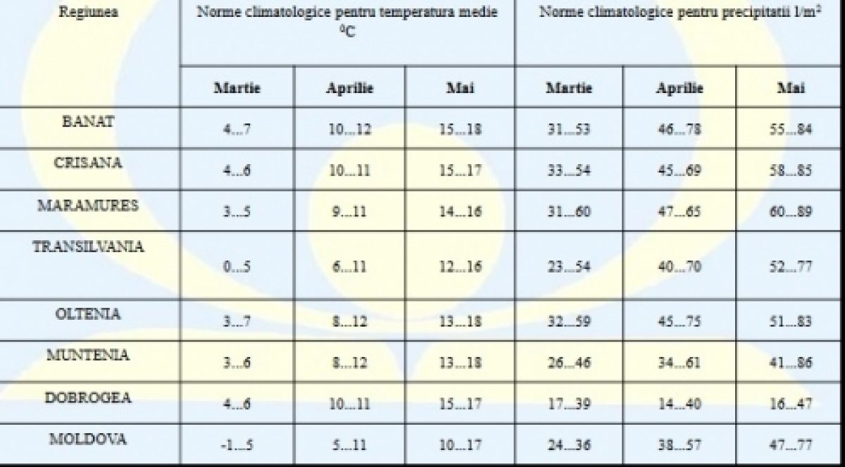 Martie 2017- Temperaturile medii lunare vor fi apropiate de normă în cea mai mare parte a teritoriului, posibil mai scăzute, local, în nord, centru şi vest. Cantităţile totale de precipitaţii se vor situa peste normele climatologice în cea mai mare parte a ţării. Mercurul din termometre va urca în acestă lună până la 7 grade, iar minimele se vor situa între -1 şi 4 grade.
