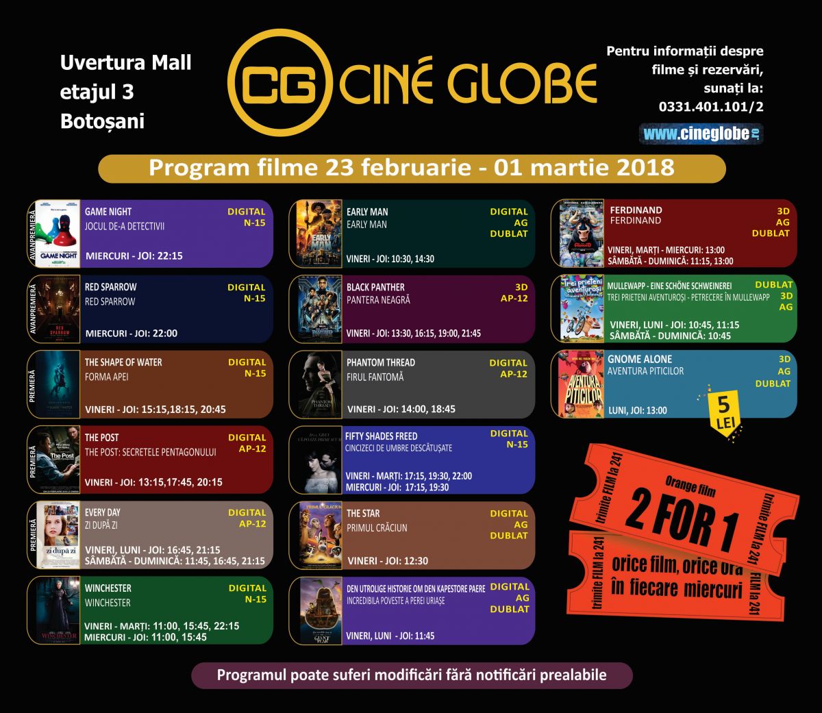 Noi pelicule pline de acţiune şi mult umor rulează la Cine Globe, din incinta Uvertura Mall, în perioada 23 februarie – 1 martie 2018.
