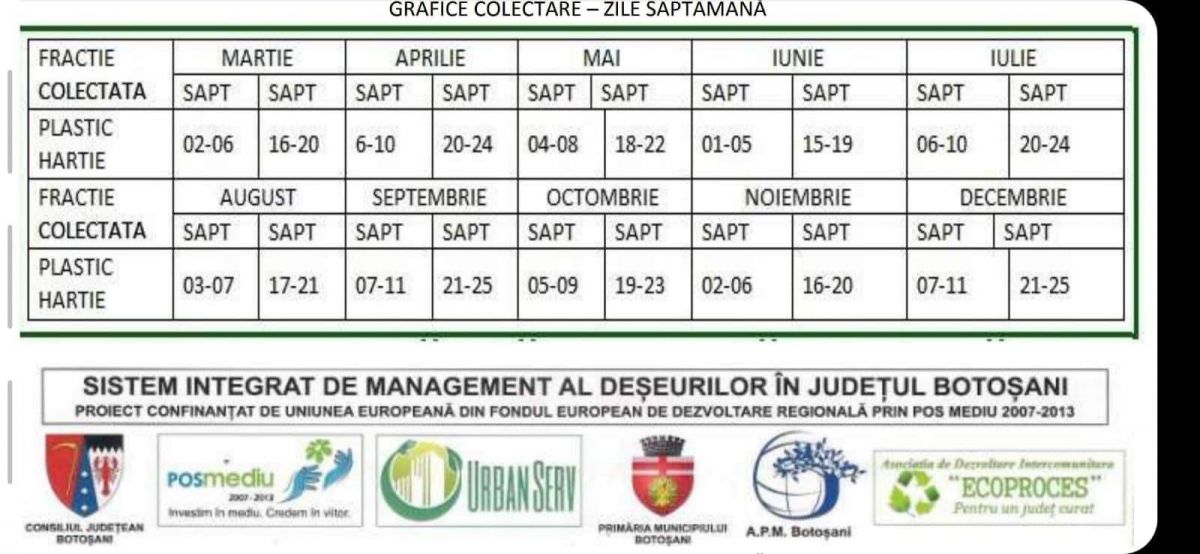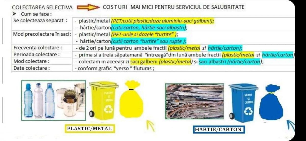 „Începând cu luna martie, colectarea deşeurilor reciclabile se va face simultan în aceeaşi zi, utilizând un autovehicul special destinat acestui scop. Programul de colectare a deşeurilor reciclabile pe străzile stabilite conform graficului anunţat va fi comun cu cel pentru colectarea deşeurilor menajere, astfel încât în zilele respective, proprietarii gospodăriilor individuale vor scoate la poartă cei doi saci cu plastic/metal, respectiv hârtie/carton şi pubela cu gunoi menajer. Colectarea deşeurilor reciclabile se va face în prima şi a treia săptămână din lună. Oamenii vor trebuie să scoată la poartă în aceeaşi zi ambii saci”,