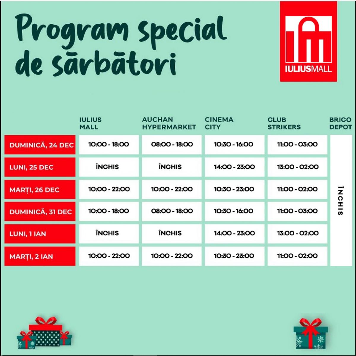 Luni, 25 decembrie, în prima zi de Crăciun, cu toții merităm un moment de respiro, astfel că Iulius Mall și Hipermarketul Auchan vor fi închise. De marți, 26 decembrie programul va fi cel obișnuit.
