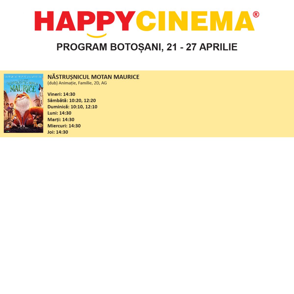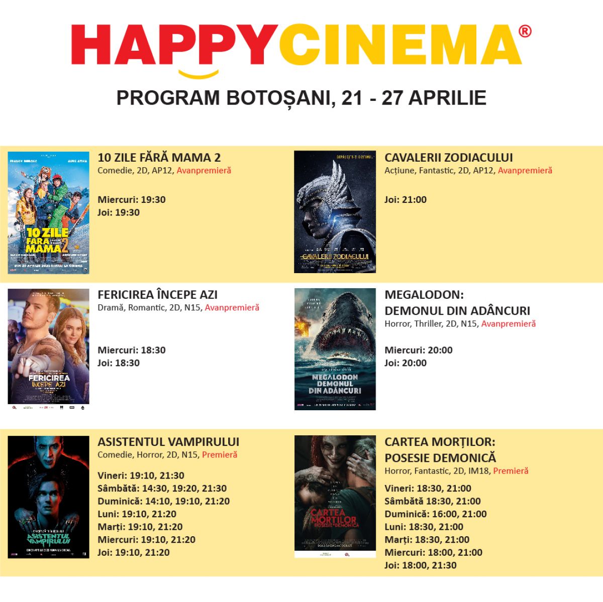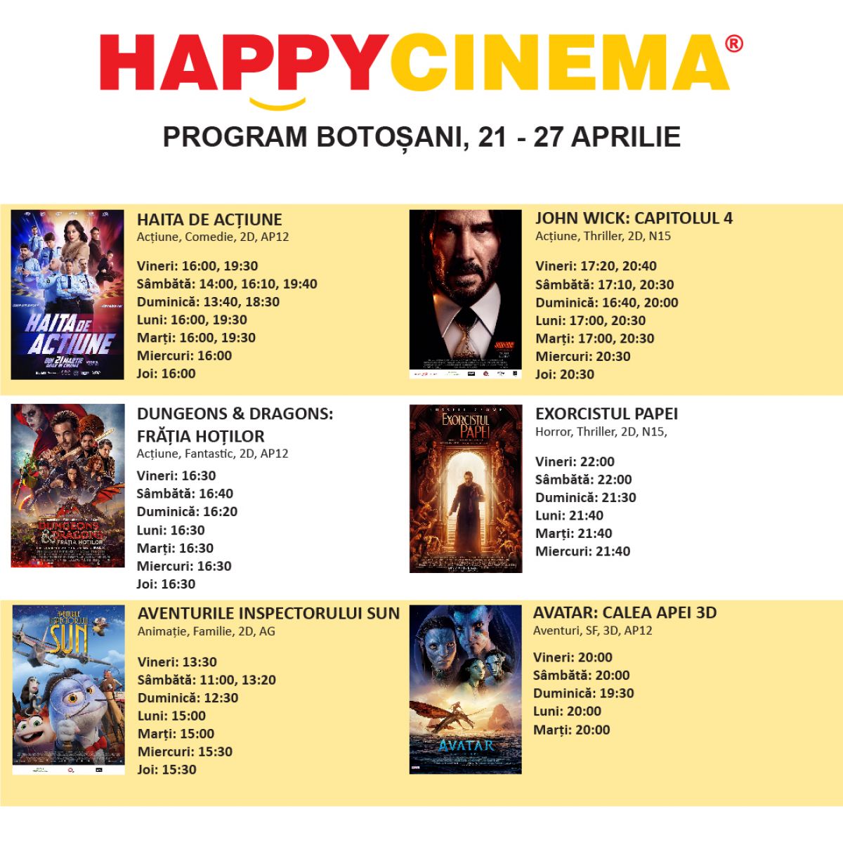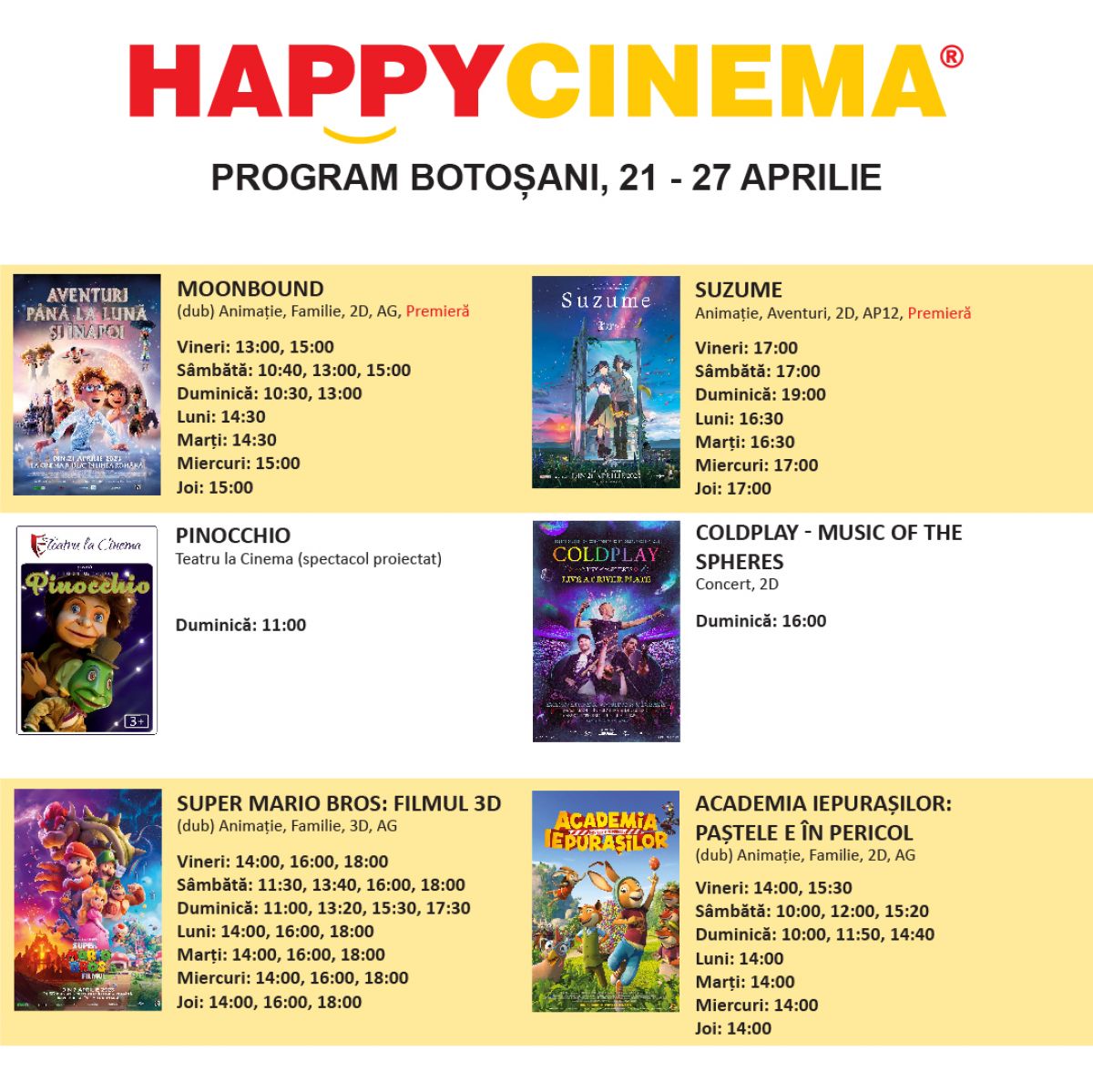 În săptămâna 21 - 27 aprilie 2023, la Happy Cinema Botoșani rulează următoarele filme: