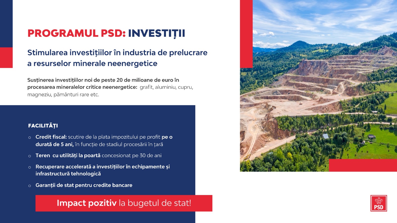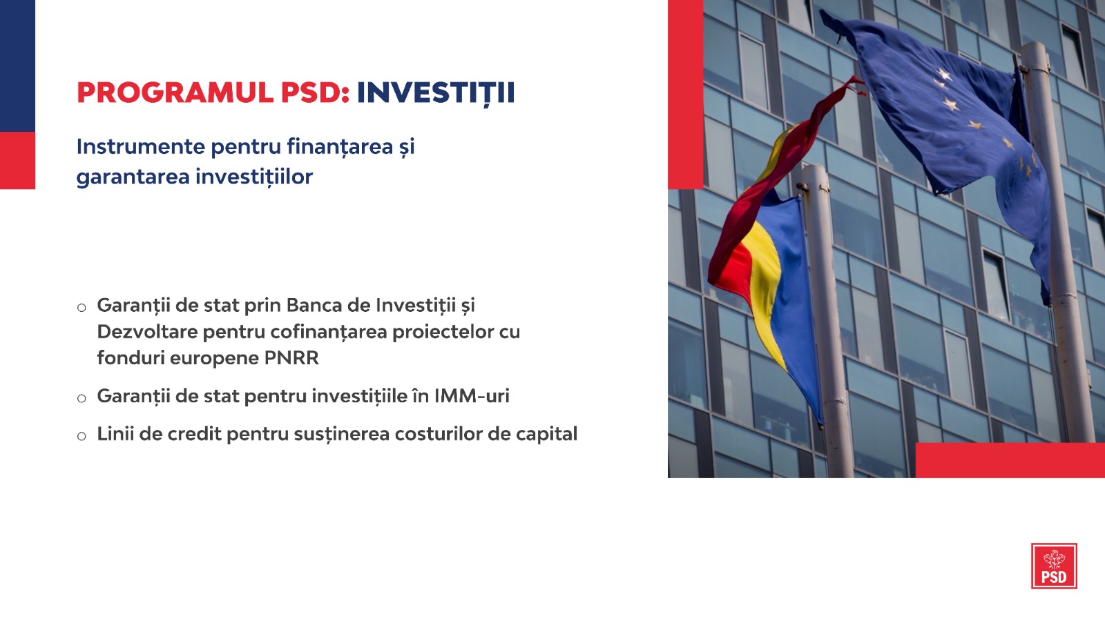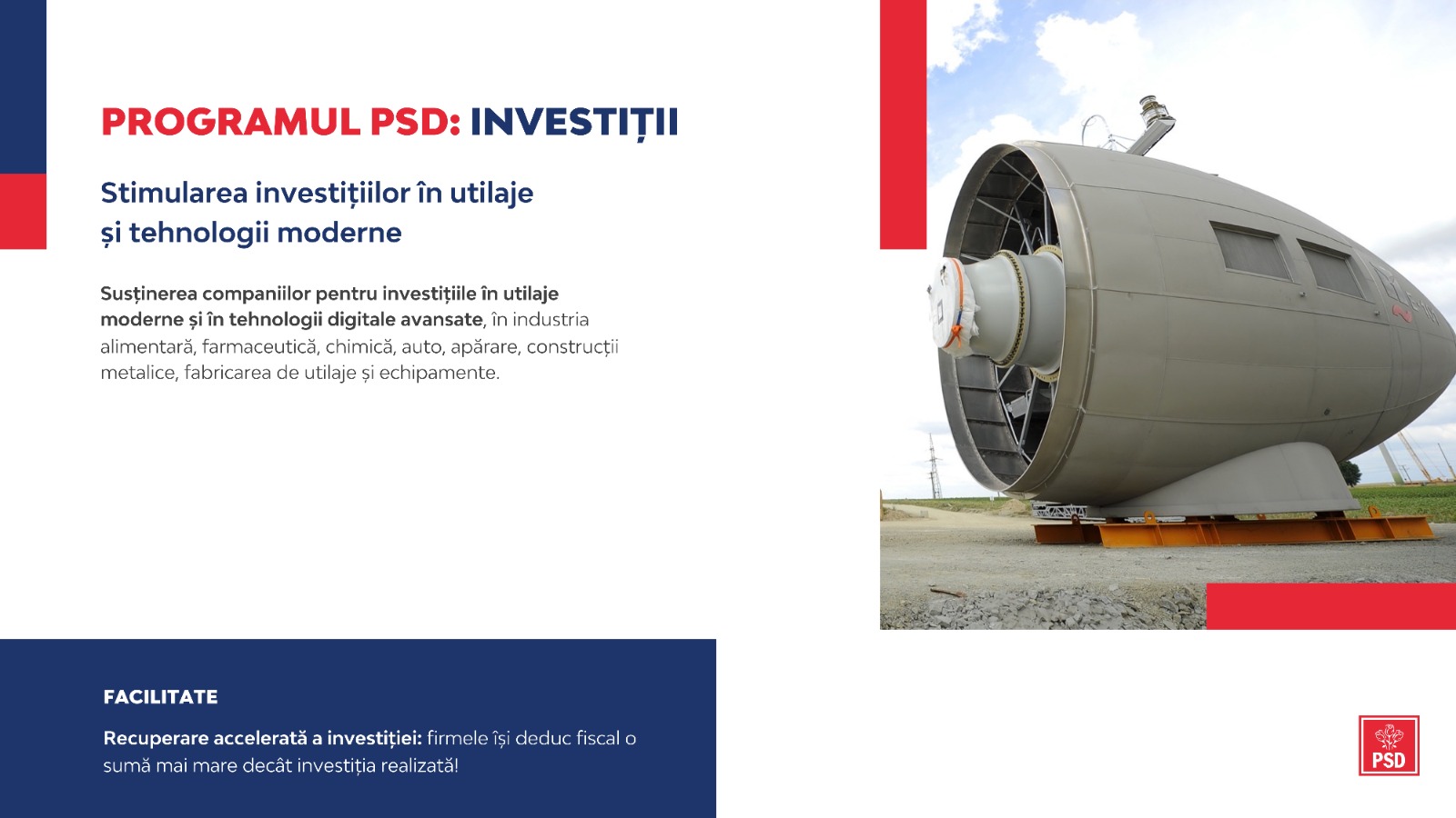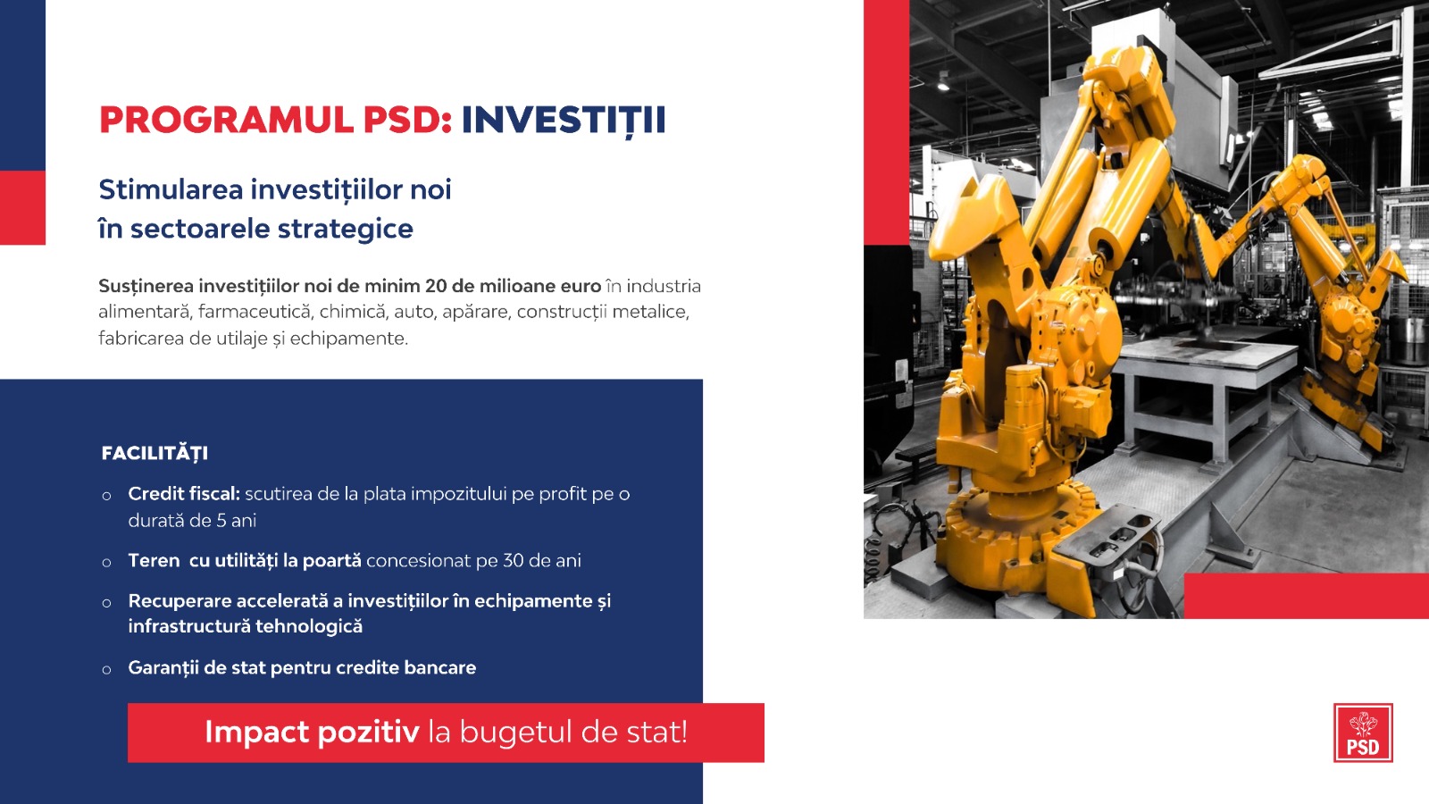 La capitolul „Investiții”, Programul PSD propune opt măsuri principale, menite să aducă valoare adăugată economiei, să stimuleze producția și să creeze locuri de muncă, cu impact direct asupra bugetului de stat.
