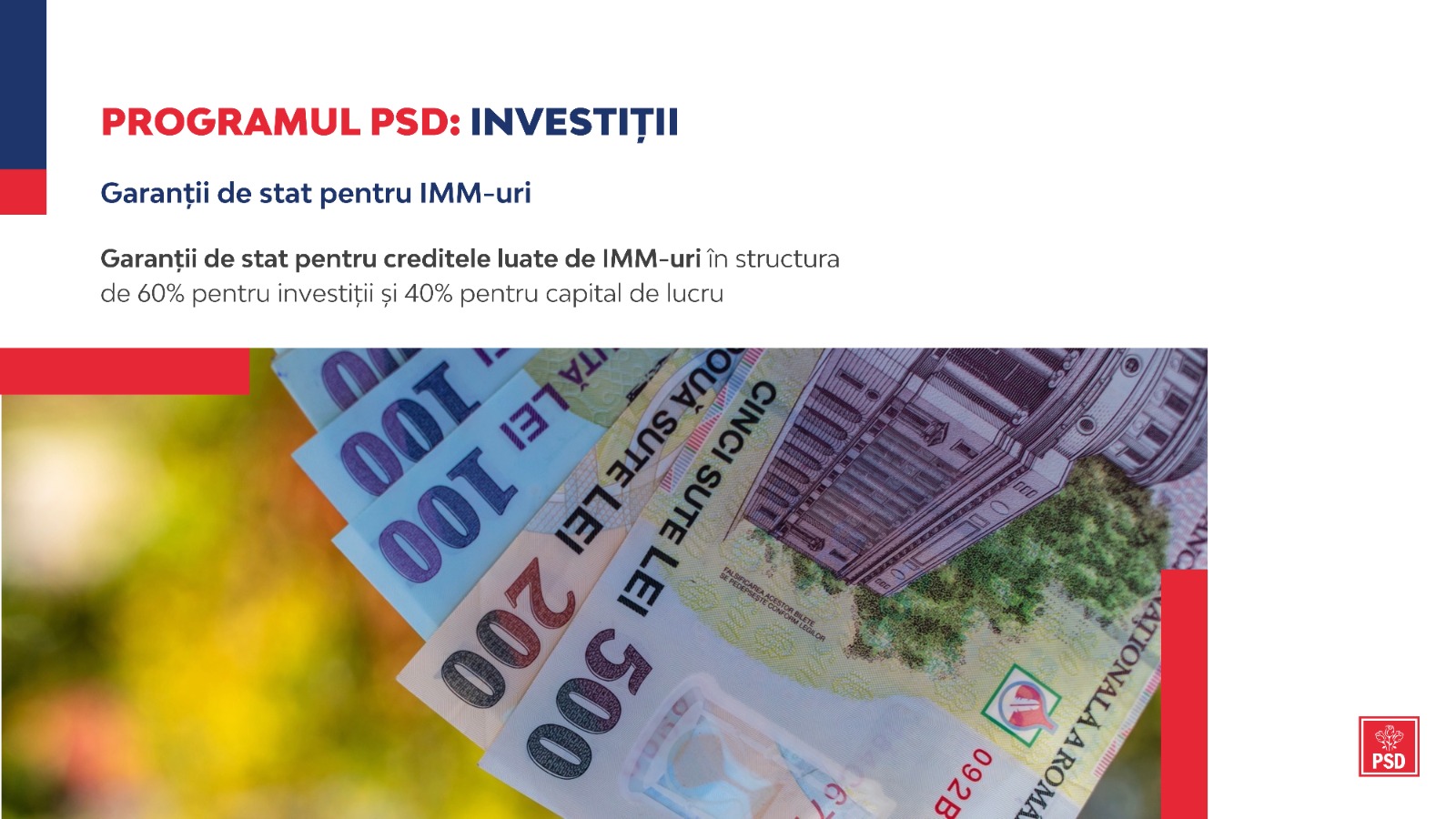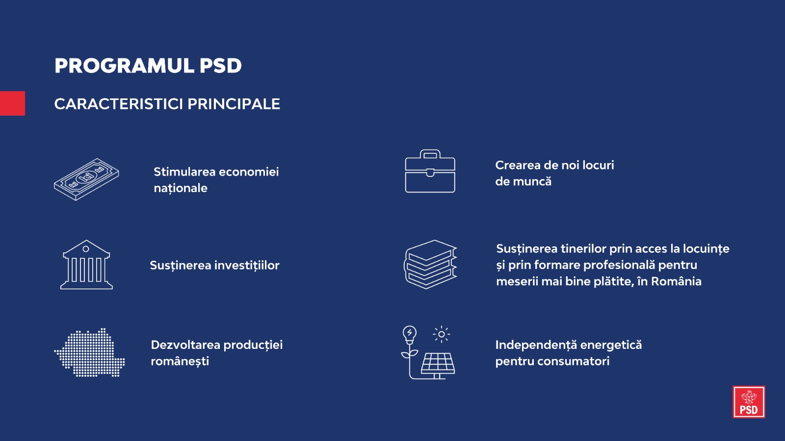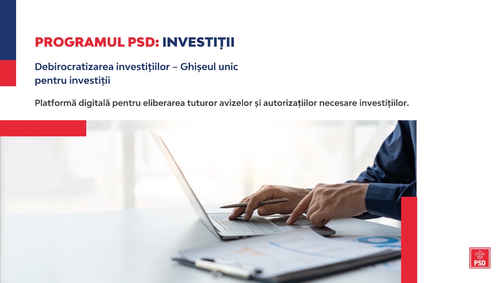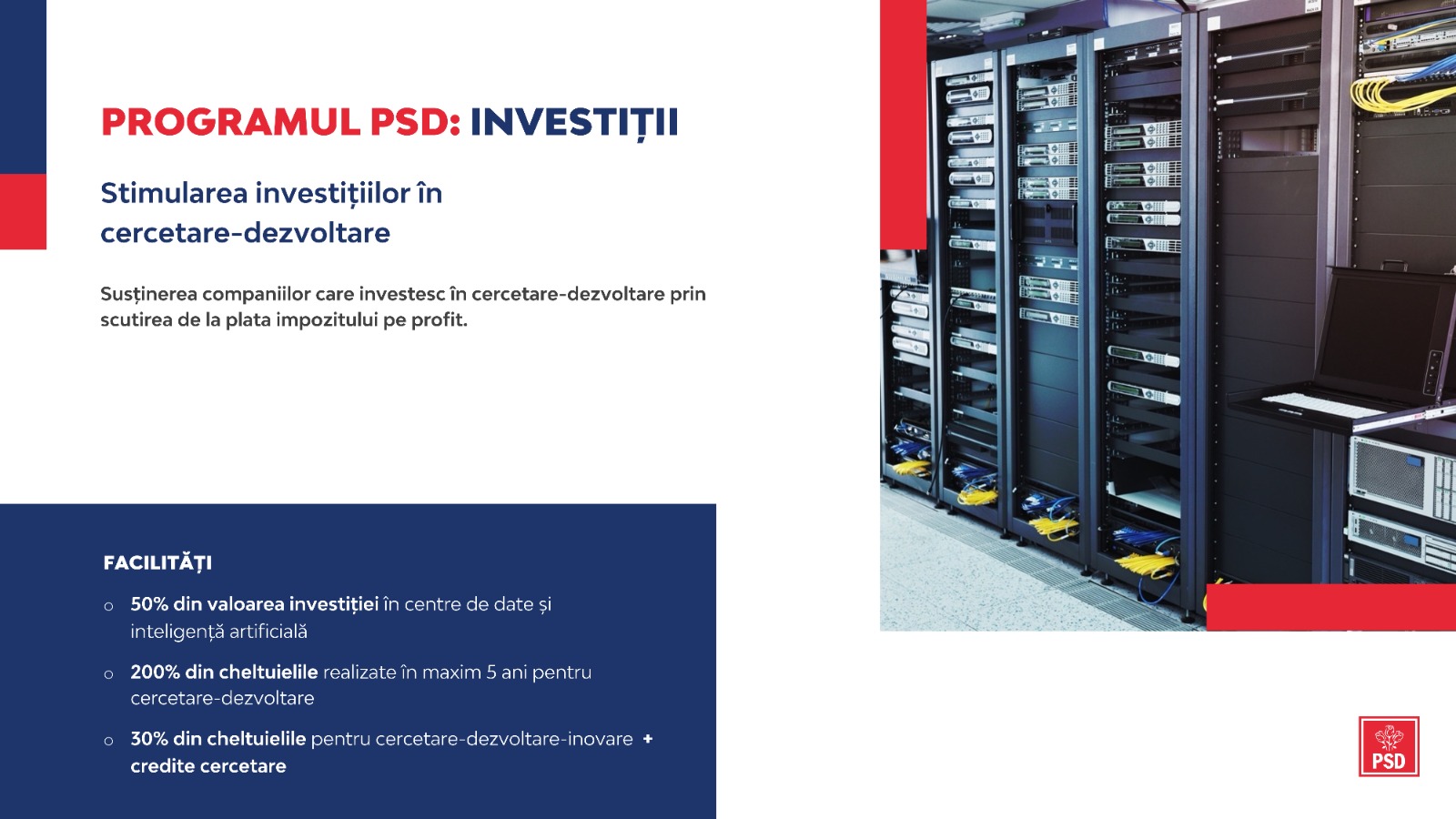 La capitolul „Investiții”, Programul PSD propune opt măsuri principale, menite să aducă valoare adăugată economiei, să stimuleze producția și să creeze locuri de muncă, cu impact direct asupra bugetului de stat.