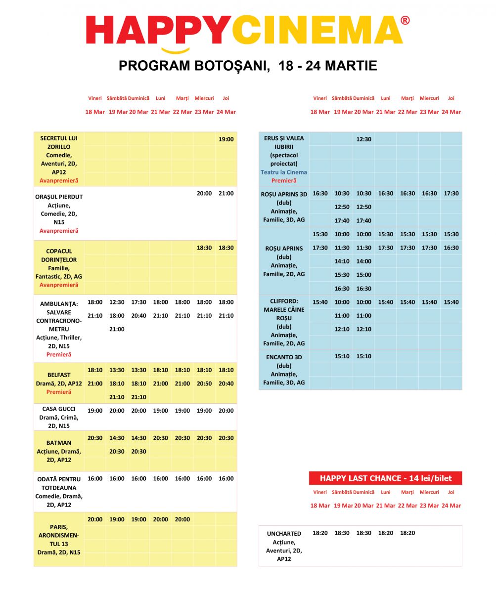 Sâmbata 10:00, 11:30, 14:10, 15:30, 16:30