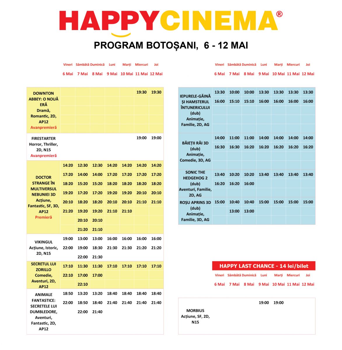 Duminica 12:30, 14:00, 15:20, 17:20, 18:20, 19:20, 20:10, 21:10