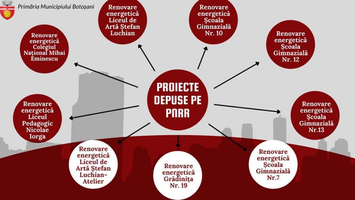 Botoșani figurează cu un total de 9 proiecte pe segmentul „Renovare energetică a clădirilor publice”, din care 7 pe tipul „Renovare energetică moderată” pentru clădirile Colegiului Național „Mihai Eminescu”, Liceul Pedagogic „Nicolae Iorga”, Liceul de Artă „Ștefan Luchian”, Școlile Gimnaziale nr. 10, nr. 12, nr. 13 și Grădinița nr. 19, un proiect pe „Renovare energetică aprofundată” – Școala Gimnazială nr. 7 și un alt proiect pe „Renovare energetică integrată – consolidare seismică și renovare moderată” – Atelier Liceul de Artă „Ștefan Luchian”.
