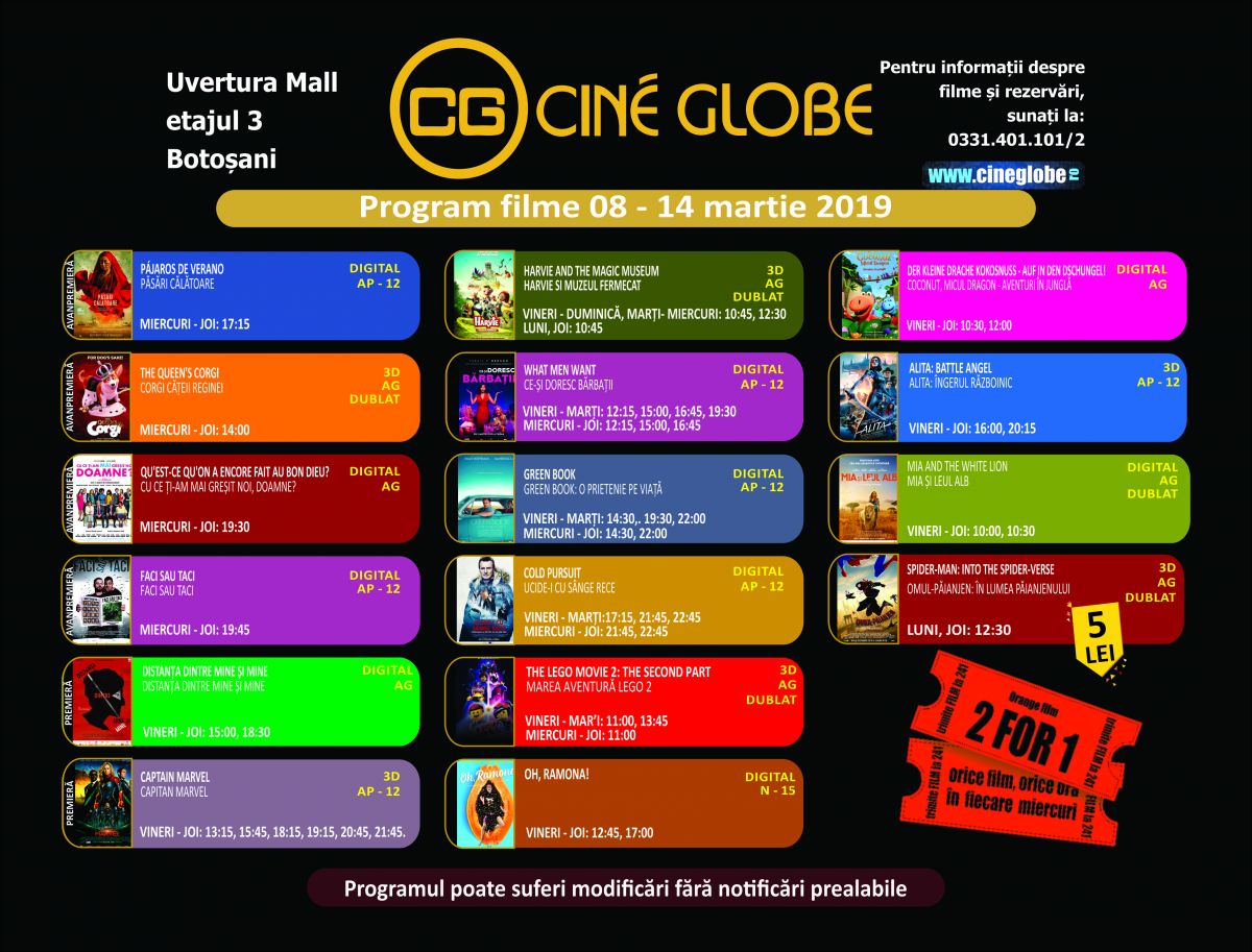 În perioada 8 – 14 martie 2019 multiplexul din Uvertura Mall Cine Globe invită botoșănenii să urmărească în avanpremieră cele mai noi filme.