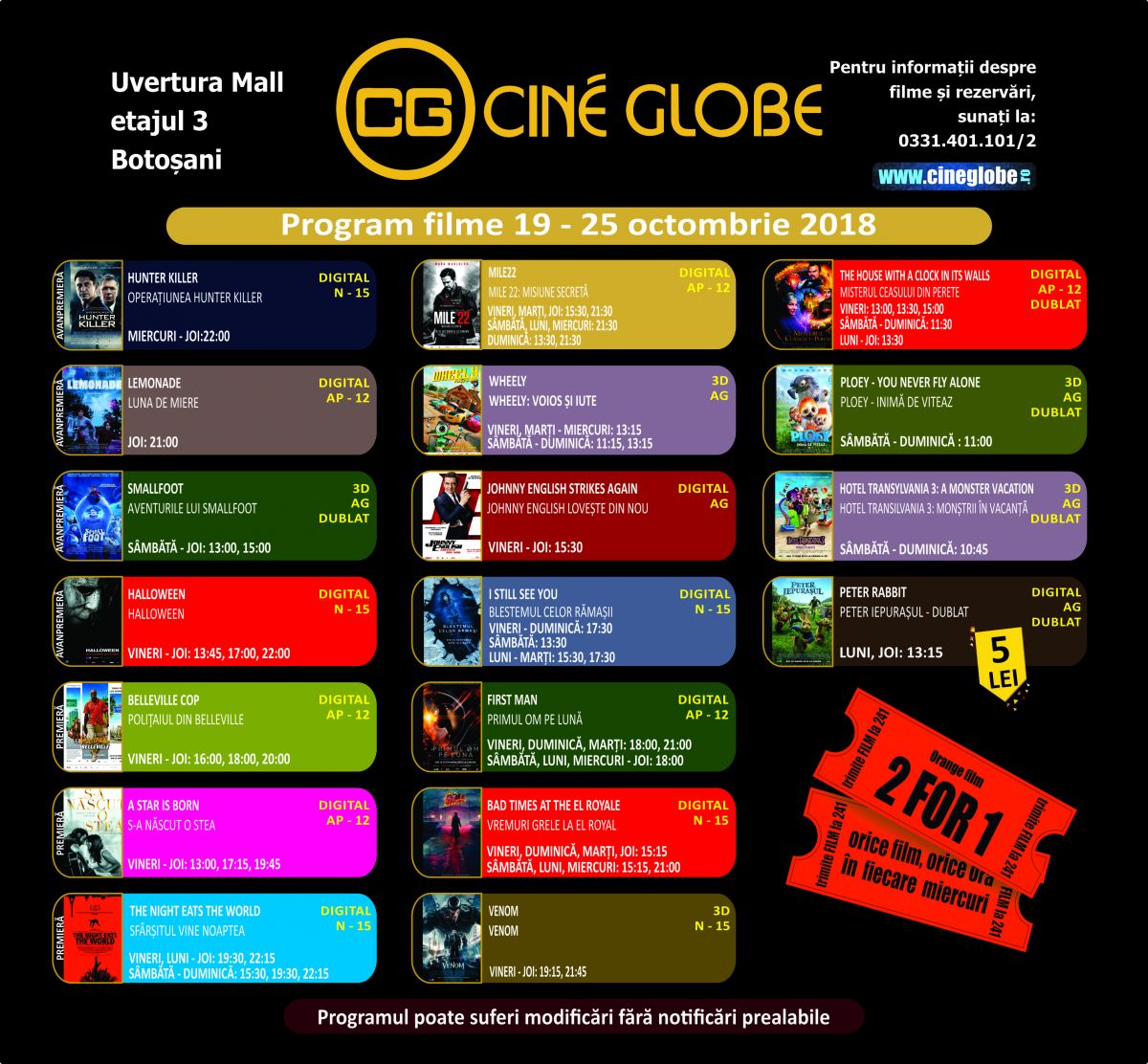 În perioada 19– 25 octombrie 2018 multiplexul din Uvertura Mall Cine Globe invită botoșănenii să urmărească în avanpremieră cele mai noi filme.