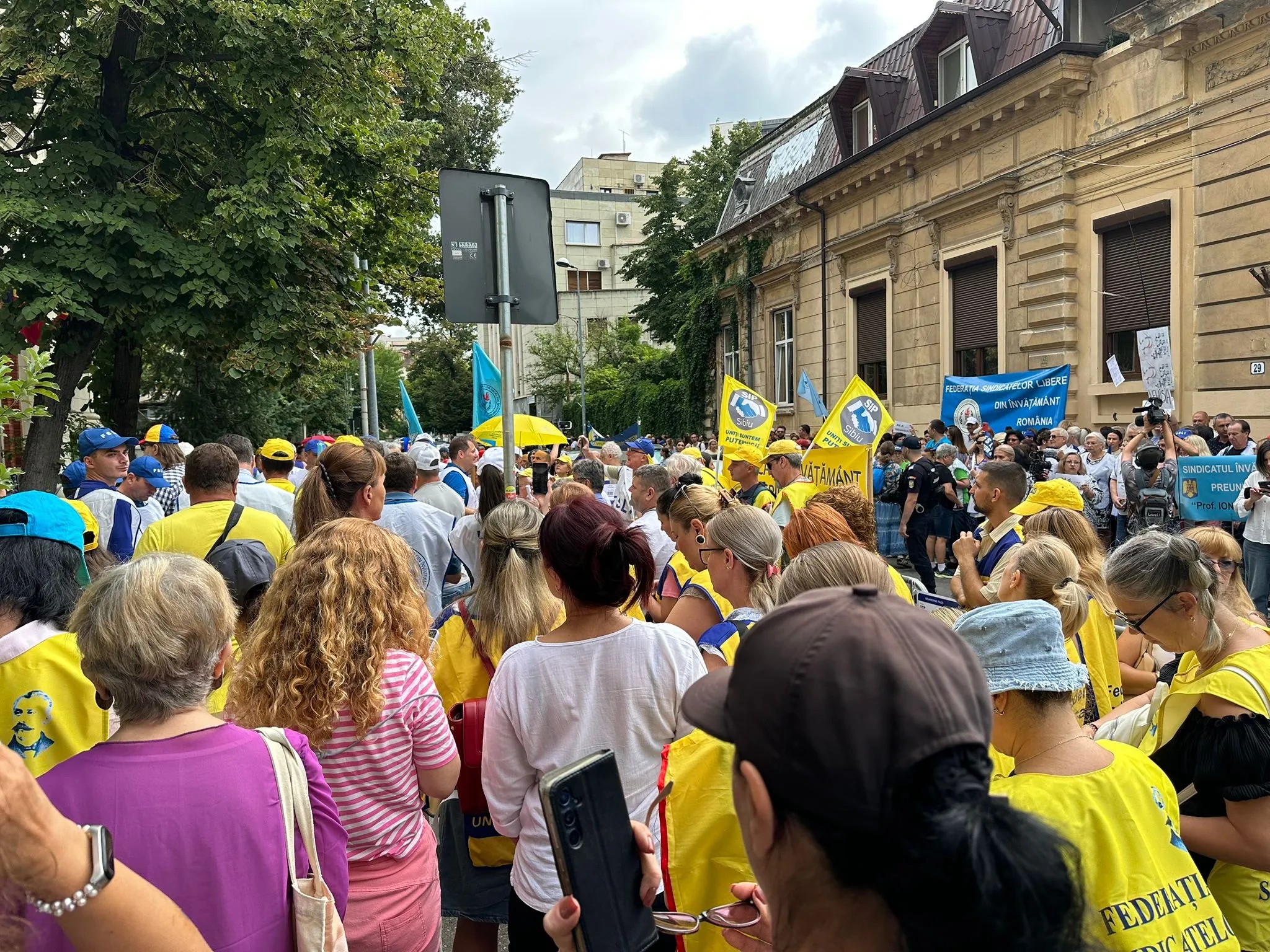 „Jos, jos, jos, ministru mincinos!”, strigă profesorii adunați azi în fața sediului Ministerului Educației, de o parte si de alta a trotuarului. Participanții sunt aduși organizat la manifestație de federațiile din învățământ.