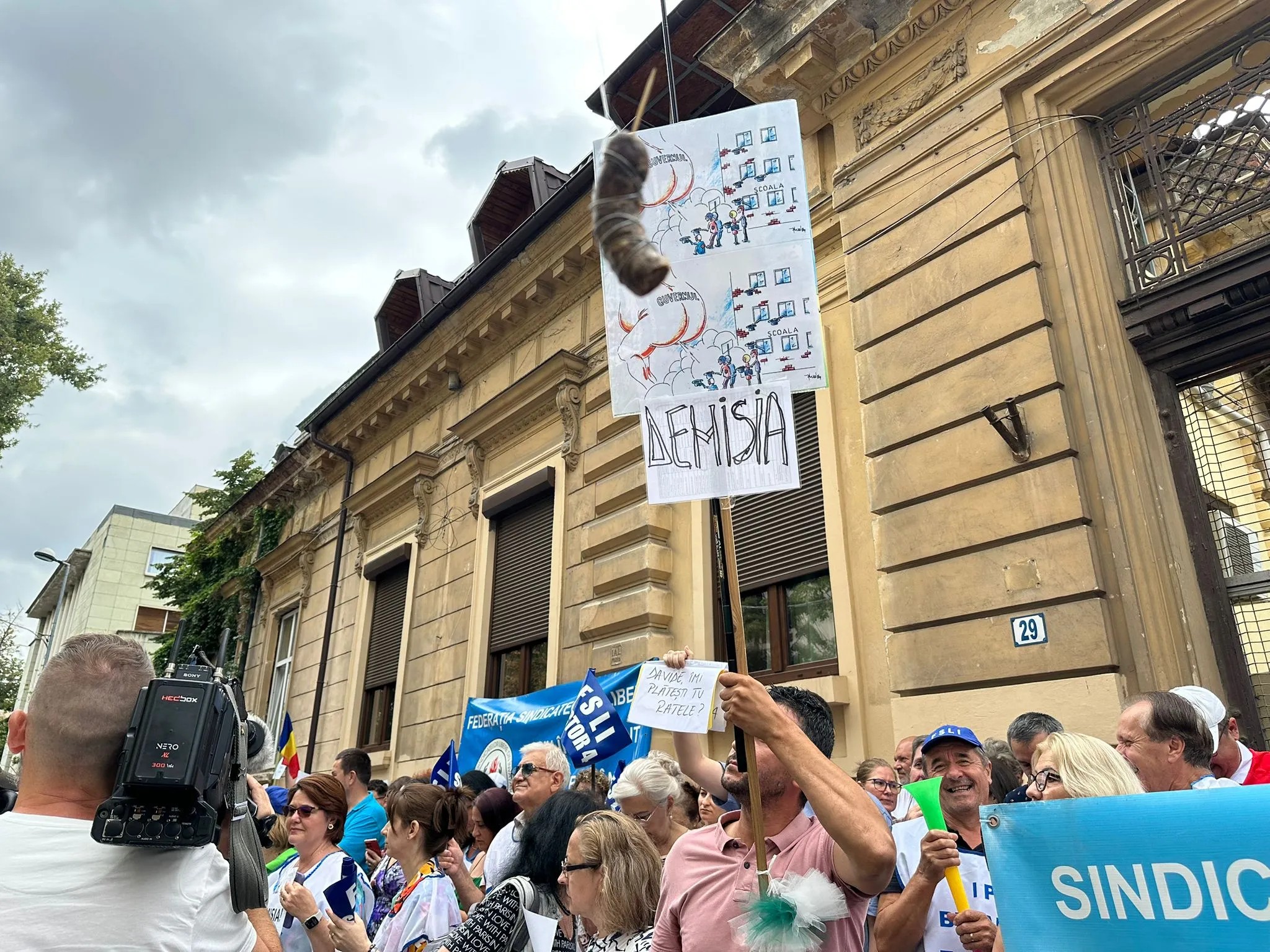 Pe pancartele ținute de profesori sunt mesaje adresate ministrului Educației, Daniel David și împotriva legii Bolojan: „David, imi plătești tu ratele?” , „Demisia” și „Legea nr. 141/2025=Falimentul Eucației” și „Viitorul este în clase, nu-l distrugeți cu legi stupide”.