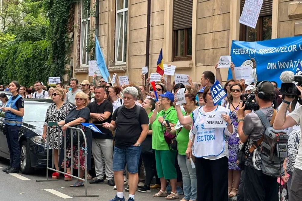 În jur de 200 de profesori veniți din mai multe județe ale țării protestează miercuri dimineață, la sediul ministerului Educației din București, față de măsurile impuse în școli prin legea Bolojan și cer demisia ministrului Educației, Daniel David.