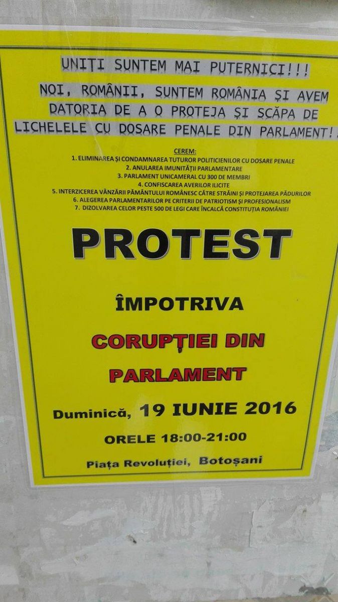 Botoșănenii au fost chemați să iasă în stradă duminică, 19 iunie 2016 în intervalul orar 18:00 – 21:00. Locația aleasă a fost Piața Revoluției.
