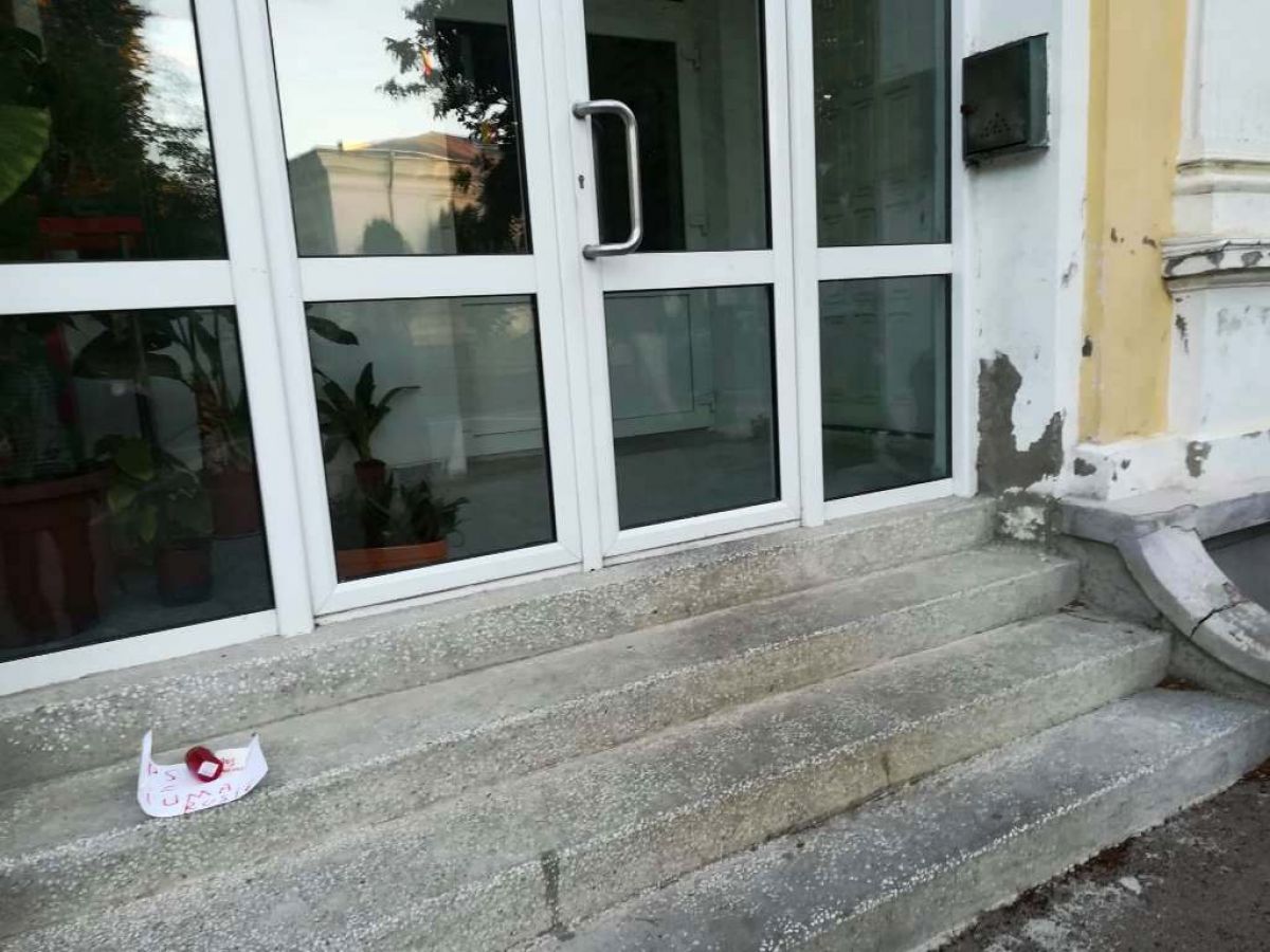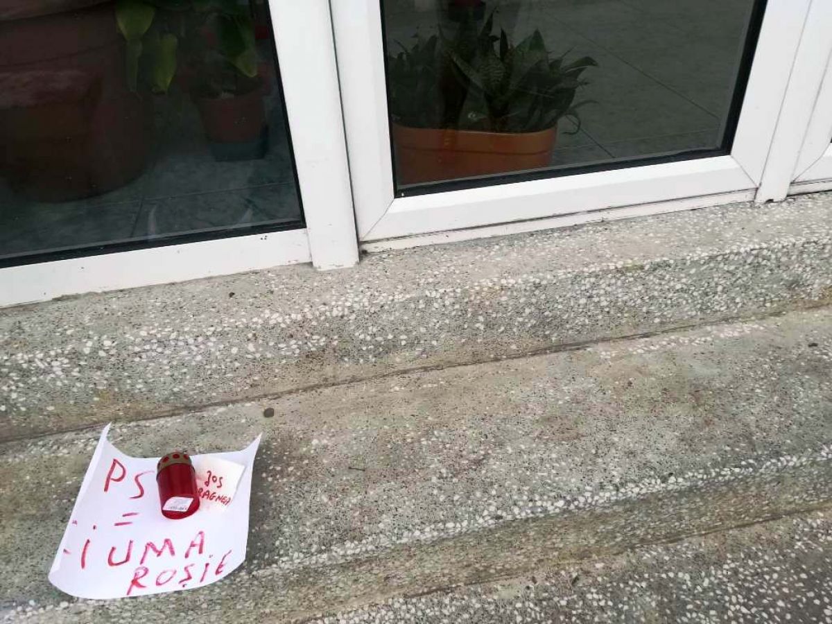 La doar câteva minute, coliva pusă în poarta social-democraţilor a dispărut, însă au rămas lumânarea şi hârtia cu amintitele mesaje.