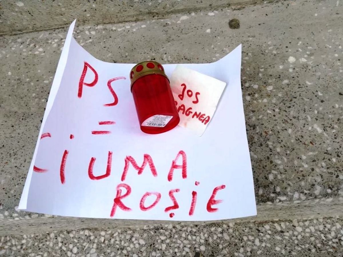 Într-una din zilele trecute pe scările PSD Botoşani s-au aşezat o colivă şi o lumânare cu mesajele: „PSD = Ciuma Roşie” şi „Jos Dragnea”.
