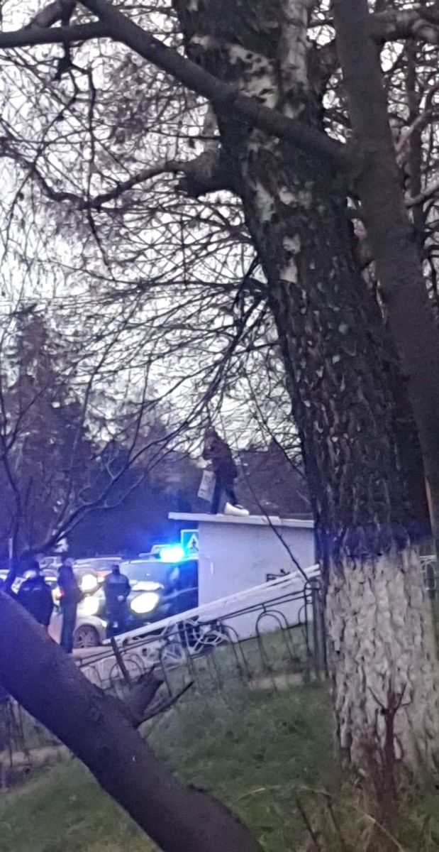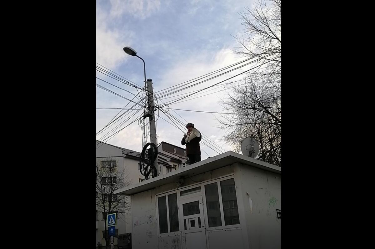 În zonă au ajuns mai multe echipaje de polițiști și jandarmi care încearcă să-l convingă pe botoșăneanul nemulțumit să coboare de pe chioșc.