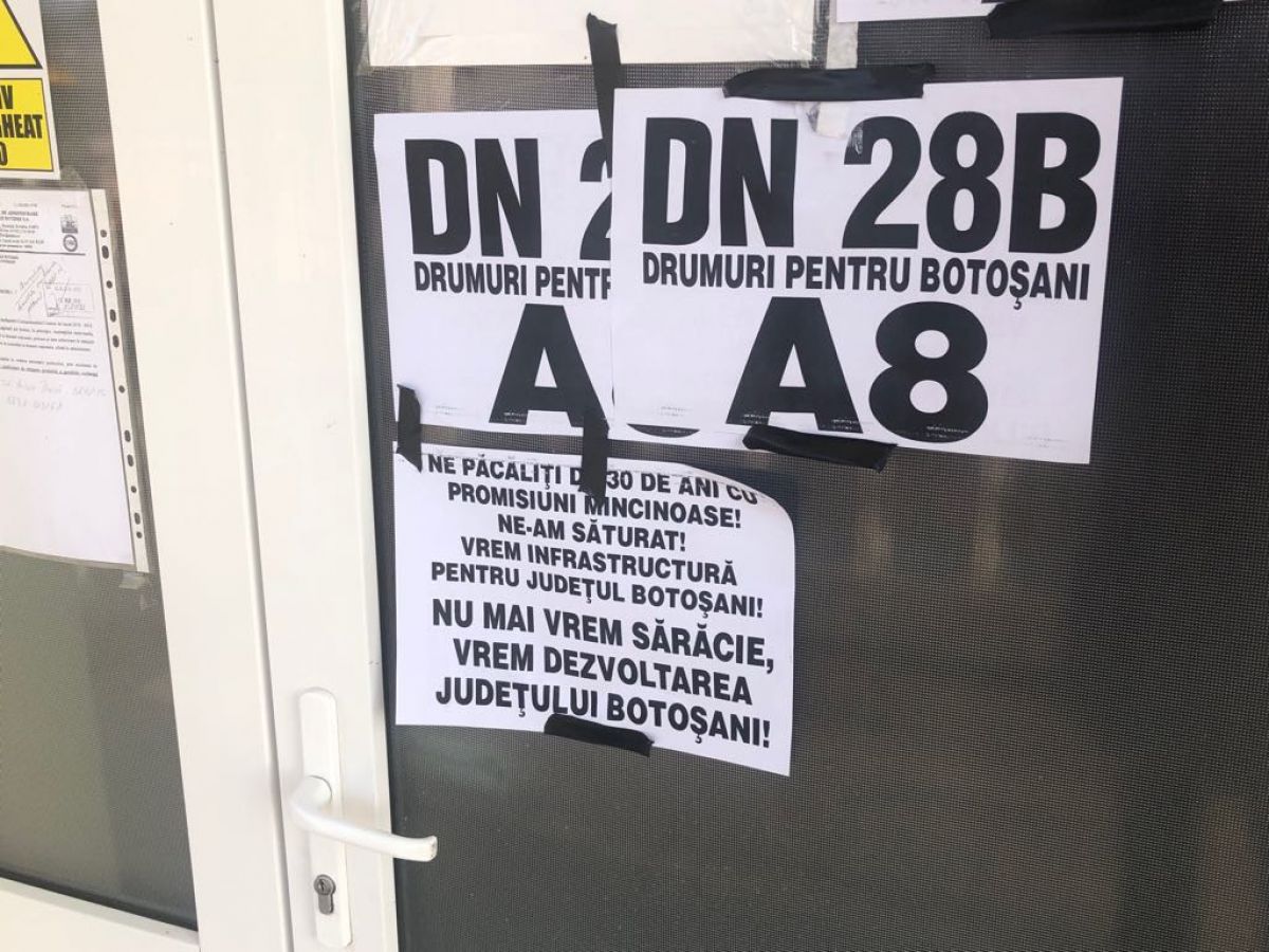 Și acolo șoferii botoșănenii au lăsat două afișe pe care scria ”DN28B DRUMURI PENTRU BOTOȘANI, A8” și ”Ne păcăliți de 30 de ani cu promisiuni mincinoase! Ne-am săturat! Vrem infrastructură pentru județul Botoșani! Nu mai vrem sărăcie, vrem dezvoltarea județului Botoșani!”. Nu au avut mare succes nici aici, căci jandarmii care i-au însoțit pe toată durata protestului au dezlipit imediat foile.