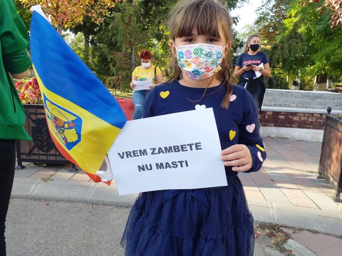 “Nu suntem de acord cu purtarea măştii, de către copii, în şcoli. Cum au ieşit mamele în multe oraşe din ţară aşa şi noi am ieşit în lupta pentru protejarea copiilor noştri. Vrem să spunem publicului despre impactul negativ pe care îl are purtarea măştilor asupra dezvoltării copiilor noştri, începând de la şase ani şi până la vârsta adolescenţei. Au obligat copiii să poarte mască patru, şase sau opt ore pe zi, cât au ei de stat la şcoală. Copilul meu vreau să beneficieze de o stare de sănătate maximă. Când îi pui copilului masca pe faţă, mai are el sănătate maximă sau dreptul la o dezvoltare normală?”, se întreabă Andreea Fetcu, iniţiatoarea protestului.