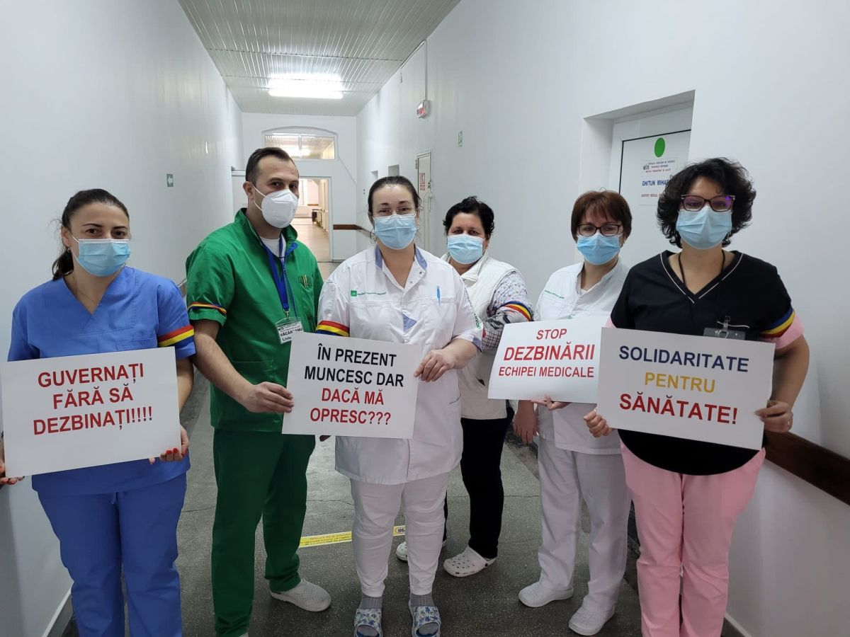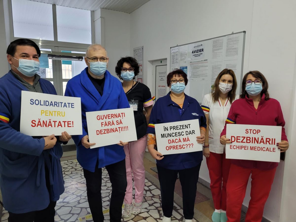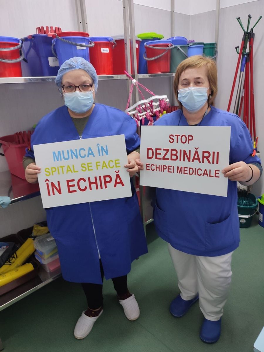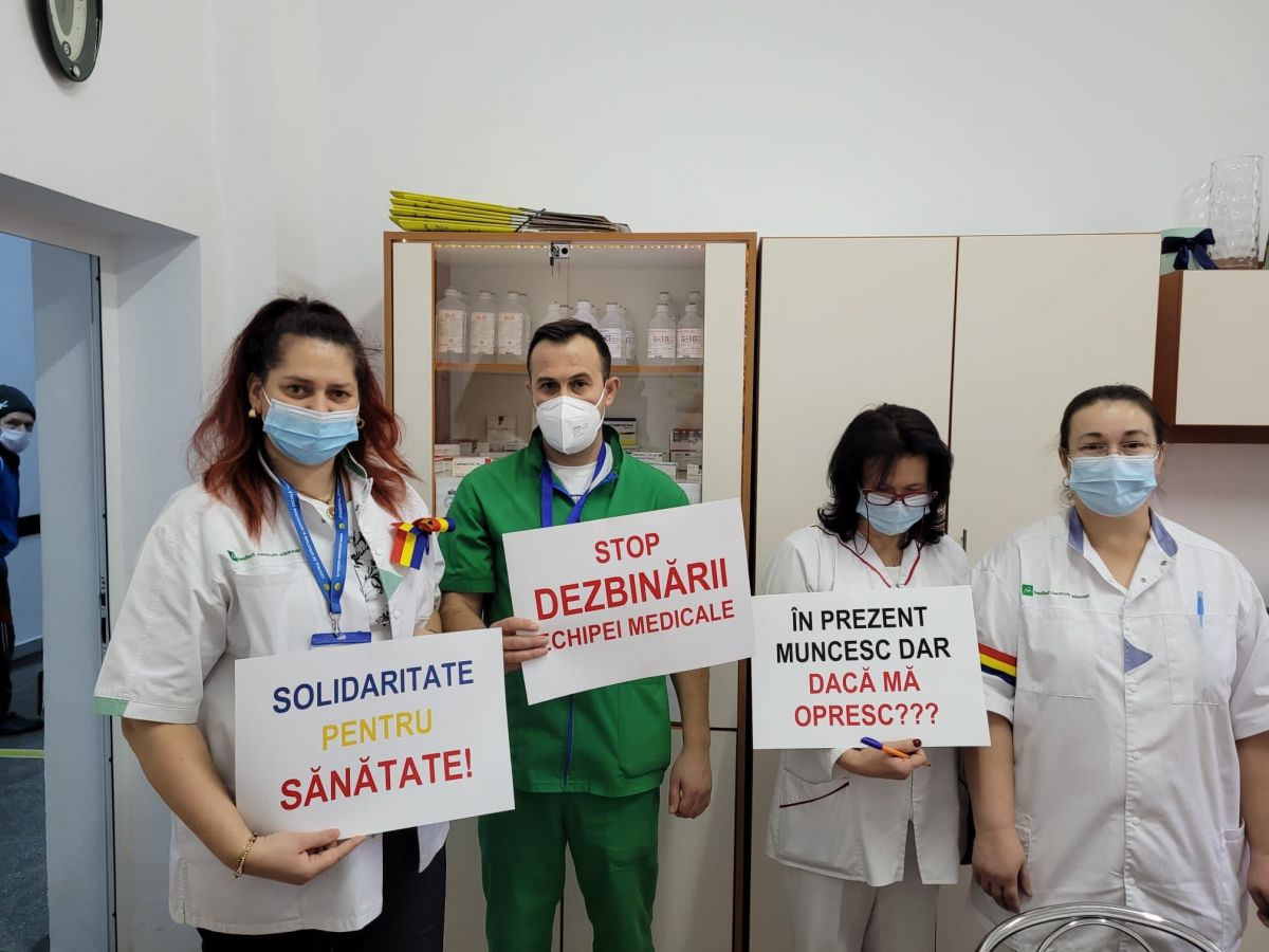 Angajații au avut în mână pancarte cu diferite mesaje precum Stop dezbinării echipei medicale, Guvernați fără să dezbinați!