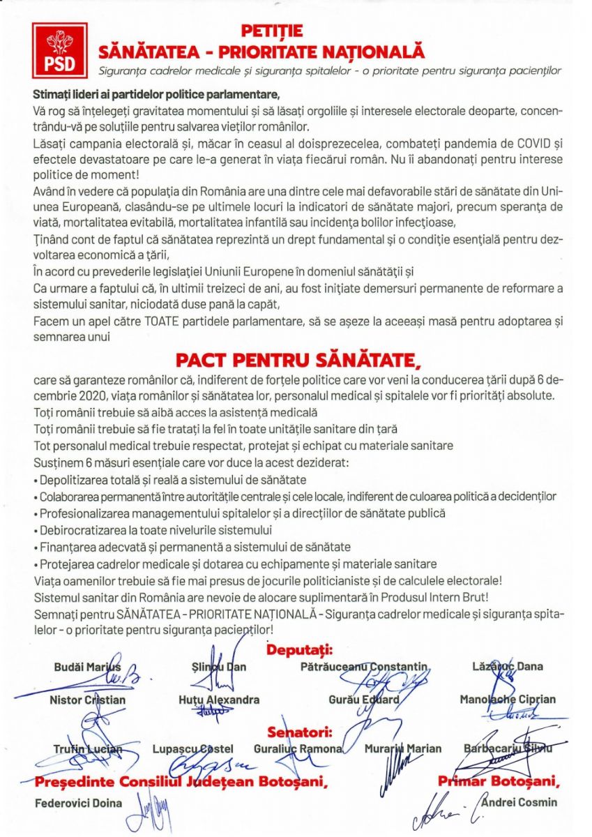 Candidații PSD Botoșani pentru Parlamentul României alături de președintele Consiliului Județean, Doina Federovici și primarul municipiului Botoșani, Cosmin Andrei au inițiat Petiția „SĂNĂTATEA – PRIORITATE NAȚIONALĂ, siguranța cadrelor medicale și siguranța spitalelor – o prioritate pentru siguranța pacienților”, care să le garanteze românilor că, indiferent de partidele care sunt la guvernare, sănătatea oamenilor, personalul medical și spitalele vor fi priorități absolute.