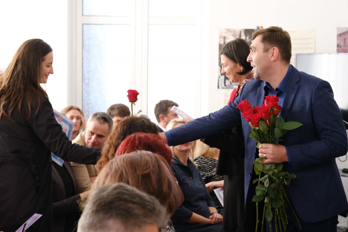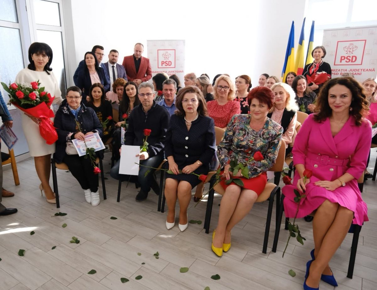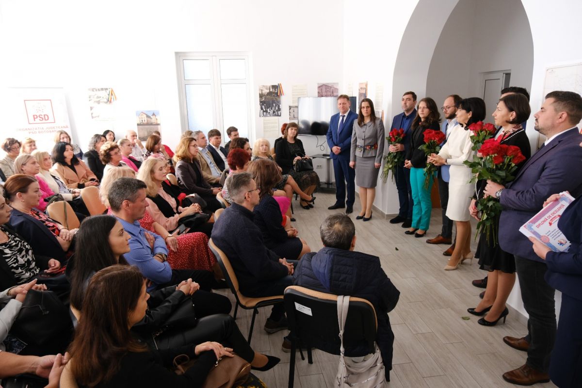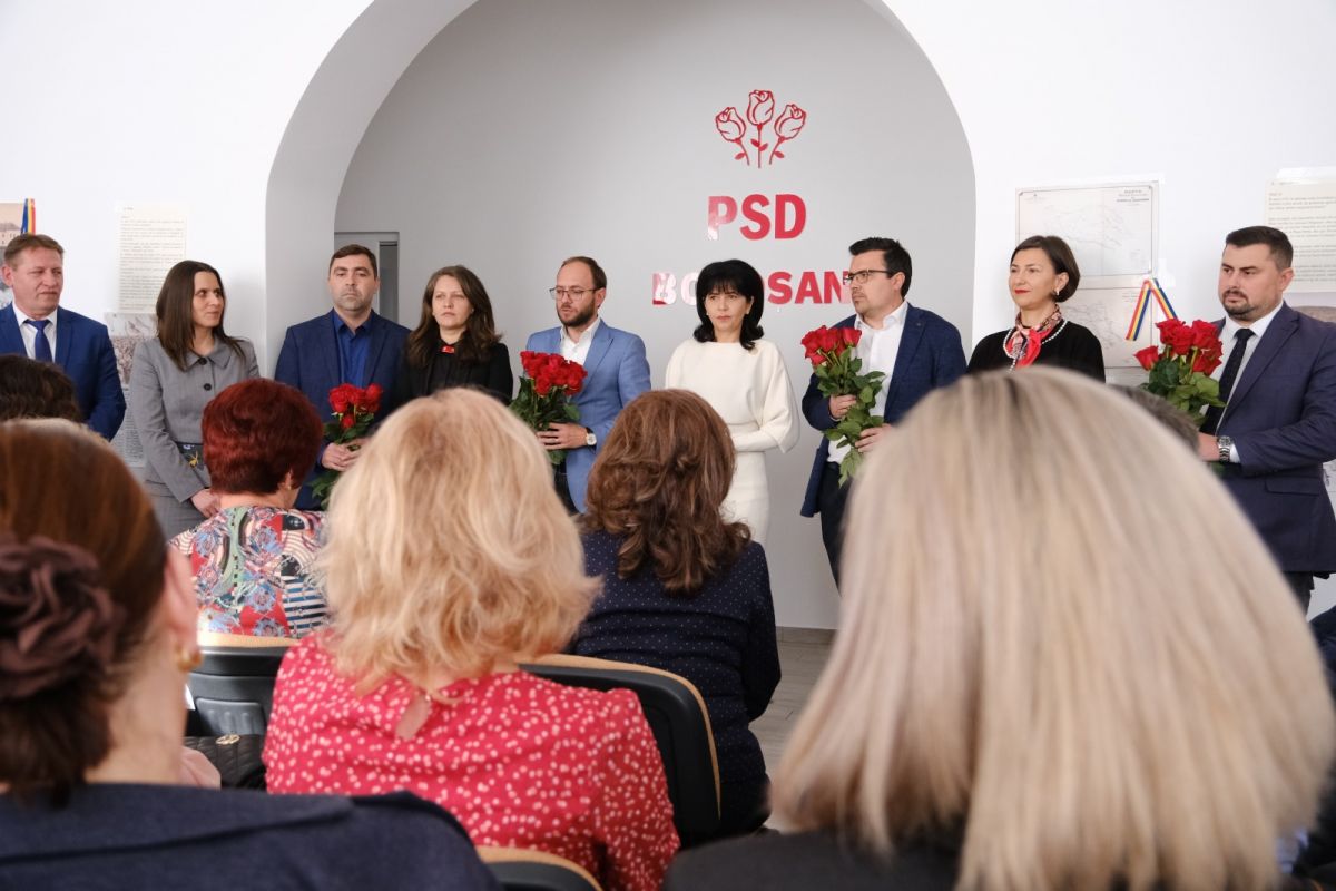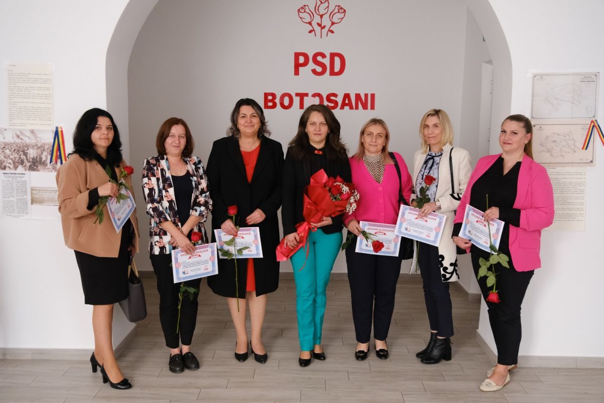 Președintele PSD Botoșani Doina Federovici, alături de secretarul executiv Alexandra Huțu, primarul municipiului Botoșani, Cosmin Andrei, de subprefecții Paula Cojocariu-Berențan și Tiberiu Manolache, viceprimarul municipiului Botoșani, Bogdan Buhăianu, administratorul public al municipiului Botoșani, Mircea Magdalena, precum și de echipa inspectorilor școlari, au oferit flori și diplome cadrelor didactice la sediul Organizației Județene, cu ocazia Zilei Educației.