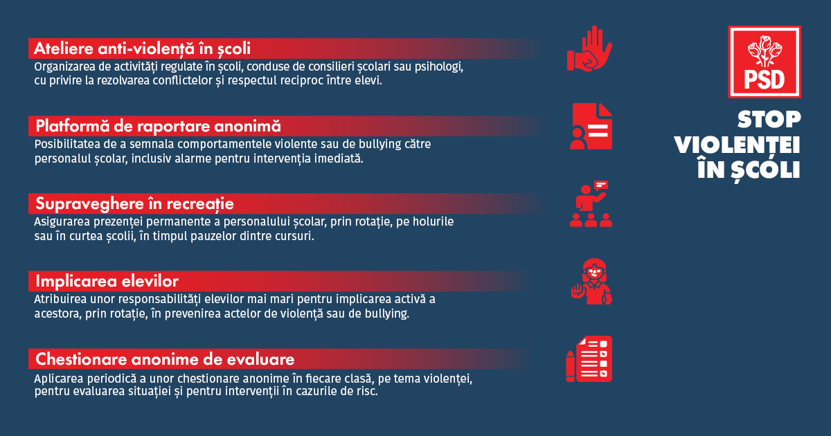 „Este foarte important ca în aceste activități de prevenție și combatere a violenței să implicăm direct profesorii, elevii și părinții acestora. De aceea prin comsilierii locali vom solicita în consiliile de administrație ale școlilor asigurarea prezenței permanente, prin rotație, a personalului școlar pe holurile sau în curtea școlii în timpul pauzelor dintre orele de curs, pentru a preveni actele de violență. La fel și atribuirea unor responsabilități elevilor din clasele superioare în prevenirea actelor de bullying din partea altor elevi. Totodată, Primăria va organiza periodic ateliere anti-violență în școli și analize pe baza unor chestionare anonime, aplicate în fiecare clasă, pe tema violenței, pentru evaluarea situației și pentru a propune intervenții în cazurile de risc”, a transmis primarul.