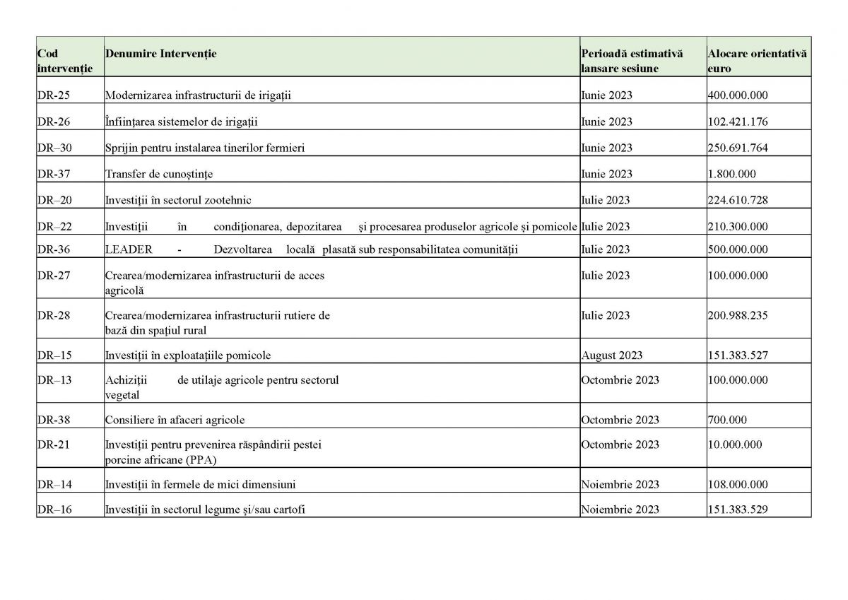 Potrivit calendarului estimativ publicat de Ministerul Agriculturii, sesiunile de depunere a proiectelor vor fi lansate de AFIR în a doua jumătate a acestui an. Printre cele mai așteptate sesiuni sunt cele care vizează înființarea sau modernizarea sistemelor de irigații, cu un buget de 400 de milioane de euro, și instalarea tinerilor fermieri, pentru care se alocă 250 de milioane de euro, ambele deschizându-se în luna iunie.
