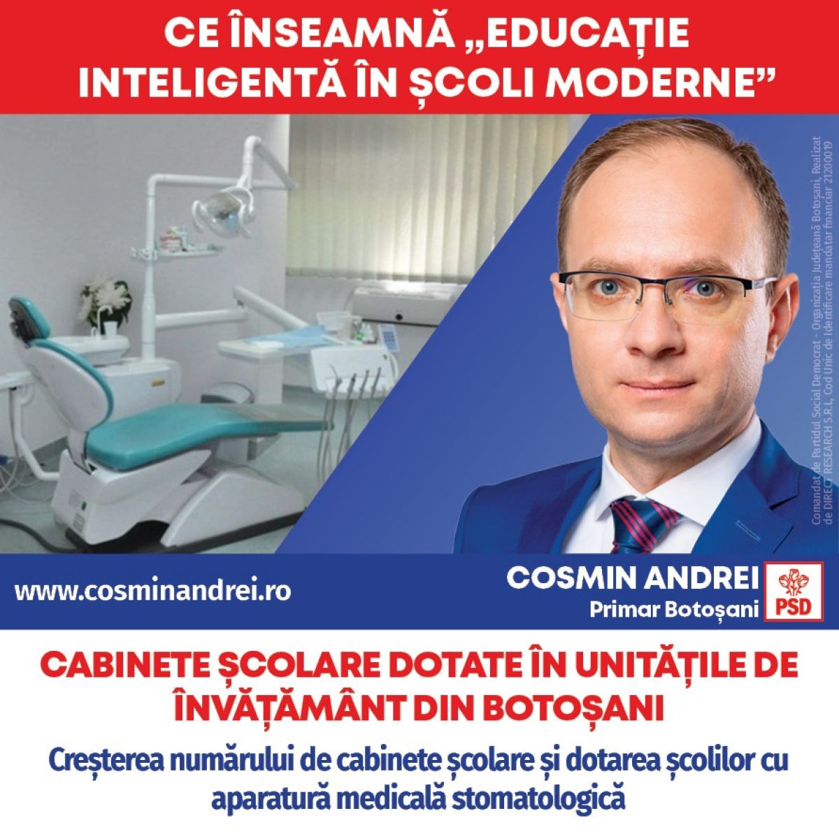 „Am pregătit în Pachetul social „GABRIELA FIREA” la Botoșani diversificarea serviciilor de medicină școlară pentru acoperirea deficitului de personal existent cu medici și asistenți medicali. În același timp, am prevăzut un plan coerent și real pentru realizarea de investiții din bugetul local și din fonduri europene pentru amenajarea de noi cabinete medicale în unitățile de învățământ și pentru dotarea cu echipamente sanitare a celor existente. Tot acest pachet de măsuri va fi însoțit de campanii de informare publică pentru promovarea unui mod de viață sănătos în rândul preșcolarilor și elevilor”, a declarat Cosmin Andrei.