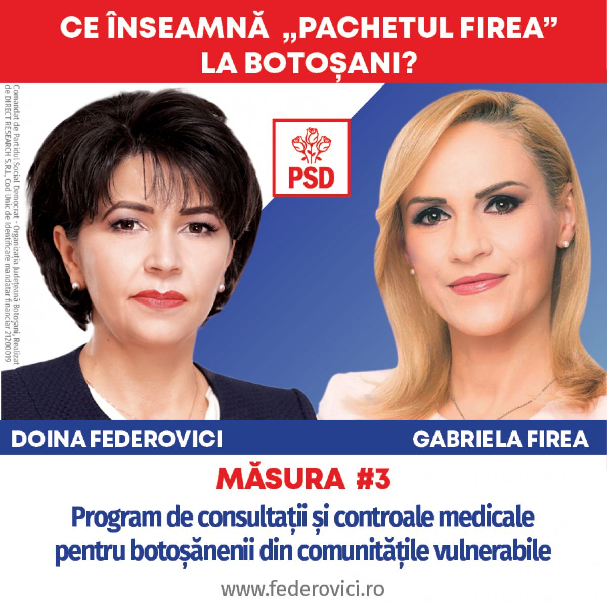 Candidatul PSD pentru Președinția Consiliului Județean, Doina Federovici a pregătit Programul „ACCES LA SERVICII MEDICALE PENTRU TOȚI BOTOȘĂNENII” prin care vor fi asigurate consultații și controale medicale gratuite pentru persoanele din comunitățile vulnerabile din județ, în parteneriat cu Direcția Generală de Asistență Socială și Protecția Copilului, Spitalul Județean, Colegiul Medicilor, Direcția de Sănătate Publică și primăriile din județ.