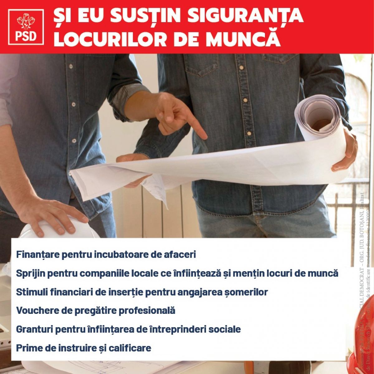 „Am elaborat împreună cu colegii mei de la Consiliul Național și în colaborare cu specialiștii noștri, cu reprezentanții sindicatelor și patronatelor, zeci de măsuri pentru relansarea pieței muncii din fiecare județ. Astfel, sunt prevăzute ajutoare de stat pentru noi locuri de muncă, stimuli financiari de inserție pentru angajarea șomerilor, prime de ocupare, de instruire și calificare, granturi pentru înființarea de întreprinderi sociale, compensarea cheltuielilor pentru locurile de muncă nou create, modificarea legislației pentru protejarea drepturilor angajaților care muncesc în companii private, creșterea salariului minim și a veniturilor tuturor angajaților, sprijin direct antreprenorilor pentru relansarea și dezvoltarea lanțurilor de producție locală și multe alte măsuri pentru sporirea nivelului de trai al fiecărui român. Obiectivele PSD în domeniul muncii sunt: să aducem 1,6 milioane de români la salariul de peste 1.000 de euro brut, să stimulăm crearea a 1 milion de contracte de muncă, să scoatem din sărăcie 1,5 milioane de oameni și să reducem cu 20% decalajul dintre rural și urban”, a declarat Marius Budăi, prim-vicepreședinte PSD Botoșani.