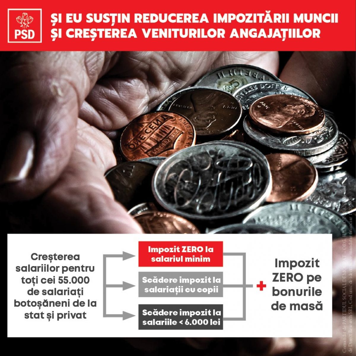 PSD este, în acest moment, singurul partid care a pregătit soluții reale și concrete pentru reducerea impozitării muncii și creșterea veniturilor tuturor angajaților de la stat și de la privat, precum și stimulente financiare dublate de investiții publice, pentru salvarea și relansarea întreprinderilor mici și mijlocii, firmelor, antreprenorilor și fermierilor locali.