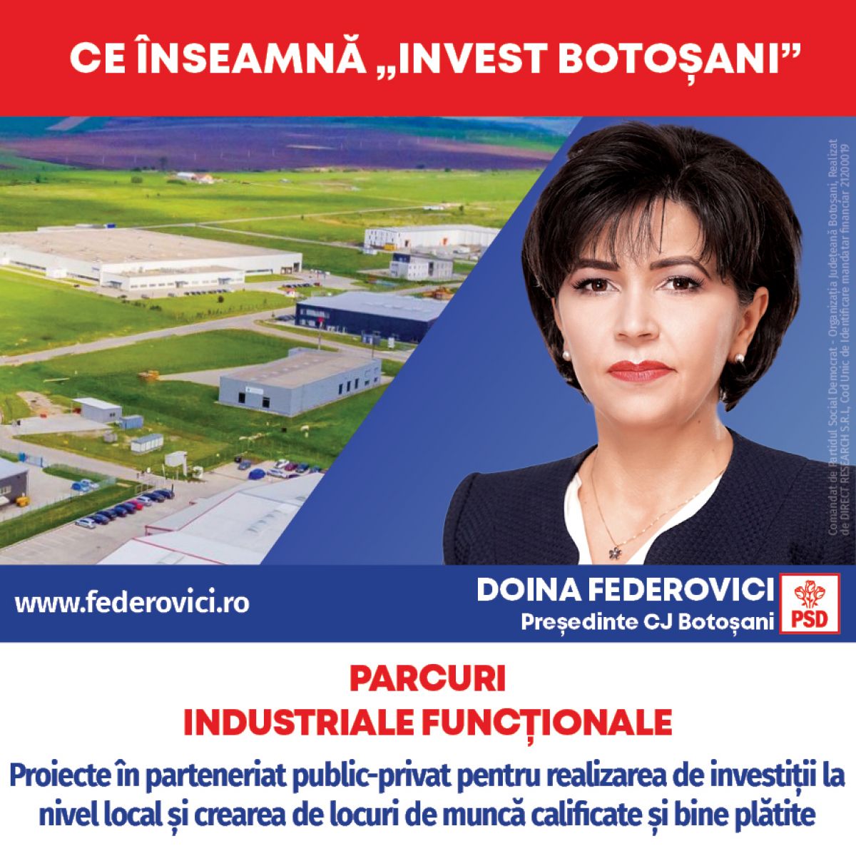 „La Consiliul Județean Botoșani împreună cu echipa mea voi pune în aplicare Programul „Invest Botoșani” cu puncte de informare pentru mediul de afaceri local și zonal. În același timp, voi organiza întâlniri lunare între reprezentanții mediului de afaceri și cei ai Consiliilor Locale și ai Consiliului Județean, în vederea identificării de noi oportunități pentru investiții în județ. În a doua etapă voi porni Programul „Parcuri Industriale funcționale” prin care vom propune proiecte în parteneriat public-privat pentru realizarea de investiții la nivel local și crearea de locuri de muncă calificate și cu salarii bune”, a declarat Doina Federovici.
