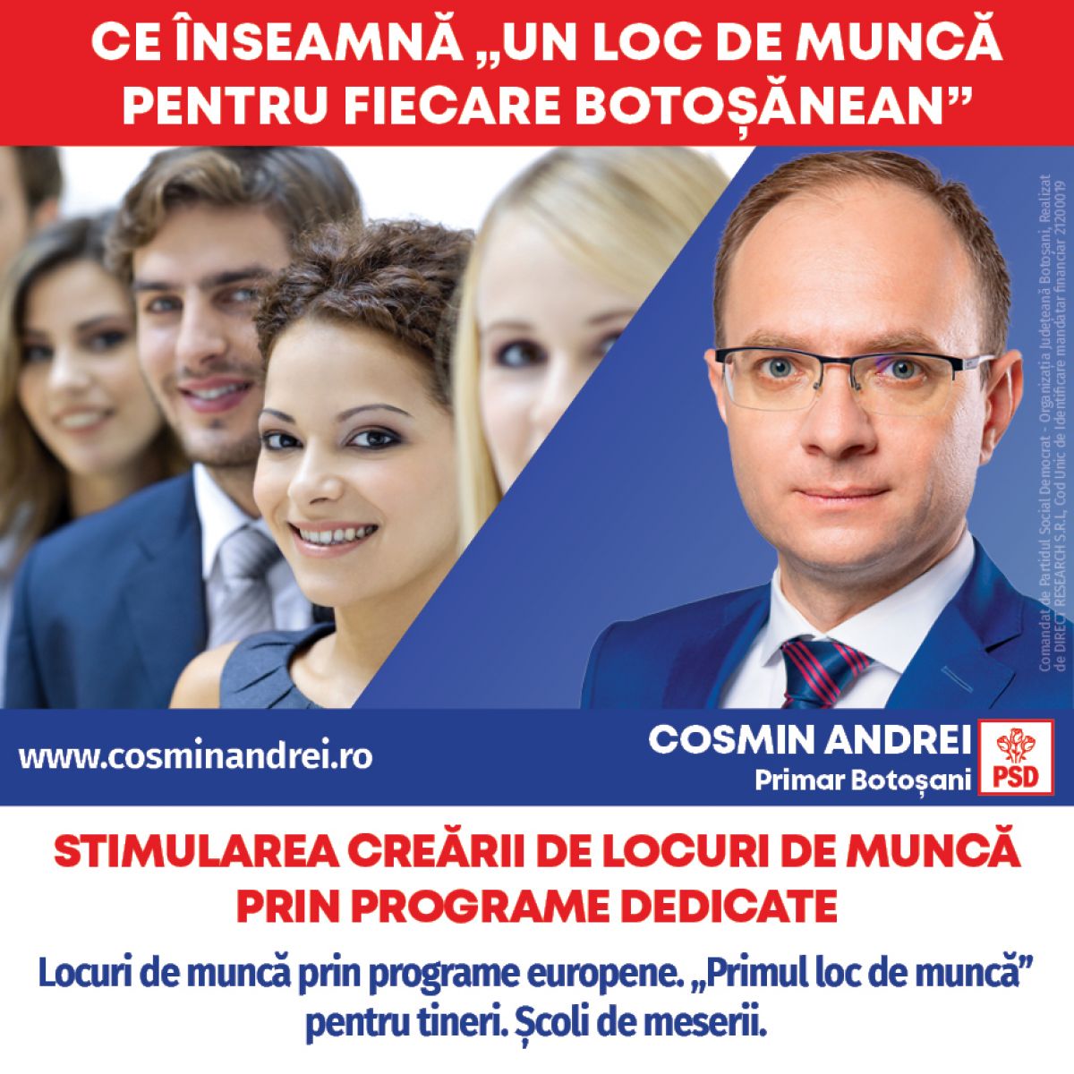 „Îmi doresc ca municipiul Botoșani să atragă companii importante pentru crearea de locuri de muncă bine plătite pentru tinerii noștri ca să nu mai fie nevoiți să plece în altă parte. Această măsură este în legătură directă cu deschiderea unei extensii la Botoșani a Universității Alexandru Ioan Cuza din Iași. Un punct central al programului meu îl reprezintă stimularea realizării de locuri de muncă prin programe europene, care sunt ușor de accesat și de implementat. Astfel avem Programul „Primul loc de muncă” pentru tinerii între 18 și 30 de ani, deschiderea de școli de meserii în sistem dual în parteneriat cu mediul de afaceri local și cu Inspectoratul Școlar Județean, Programul „Internship Administrație Botoșani” pentru pregătirea de tineri specialiști pentru administrația locală. Toate pot fi puse în practică pentru a nu ne mai pleca tinerii în afara țării sau părinții să-și lase aici copiii și ei să muncească pe brânci, în condiții grele în străinătate”, a declarat Cosmin Andrei.