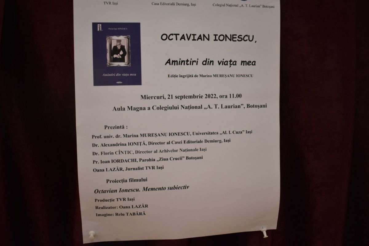 Ulterior, toată asistența formată din căutători de valoare culturală și elevi ai Colegiului Laurian a urmărit filmul ”Octavian Ionescu. Memento subiectiv”, o producție TVR Iași, realizator: Oana Lazăr, imagine: Relu Tabără. Ambii jurnaliști au fost prezenți la evenimentul inedit de astăzi.