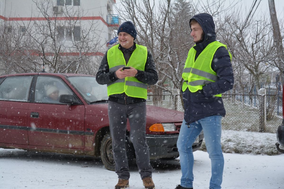 Oamenii legii sunt prezenți la eveniment pentru a asigura ordinea și liniștea publică la acțiunea de protest. Nu a fost cazul să intervină pentru că oamenii sunt pașnici, discută între ei și flutură drapelul României.