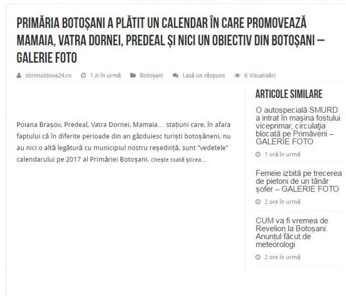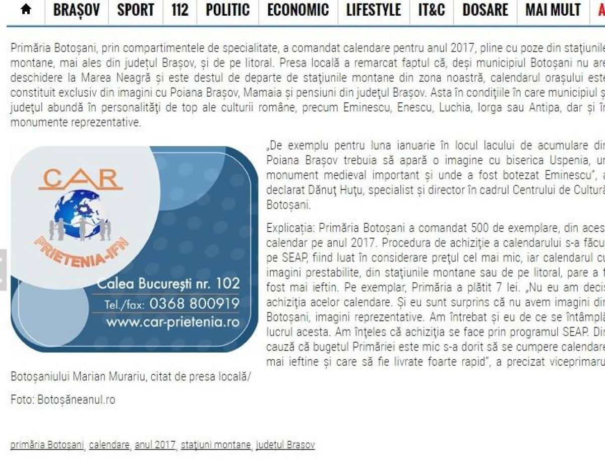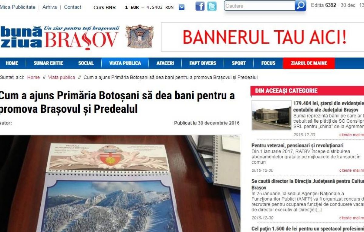 Municipalitatea de la Botoșani a plătit din bani publici un calendar de perete în care, în loc să fie promovate obiective din oraș sau măcar din județ, face reclamă unor stațiuni din cu totul alte județe. Calendarul respectiv are câte o poză pentru fiecare lună a anului și nici una dintre acestea nu este din Botoșani. În schimb apar poze din Poiana Brașov, Colibița, Predeal, Bălea Lac.