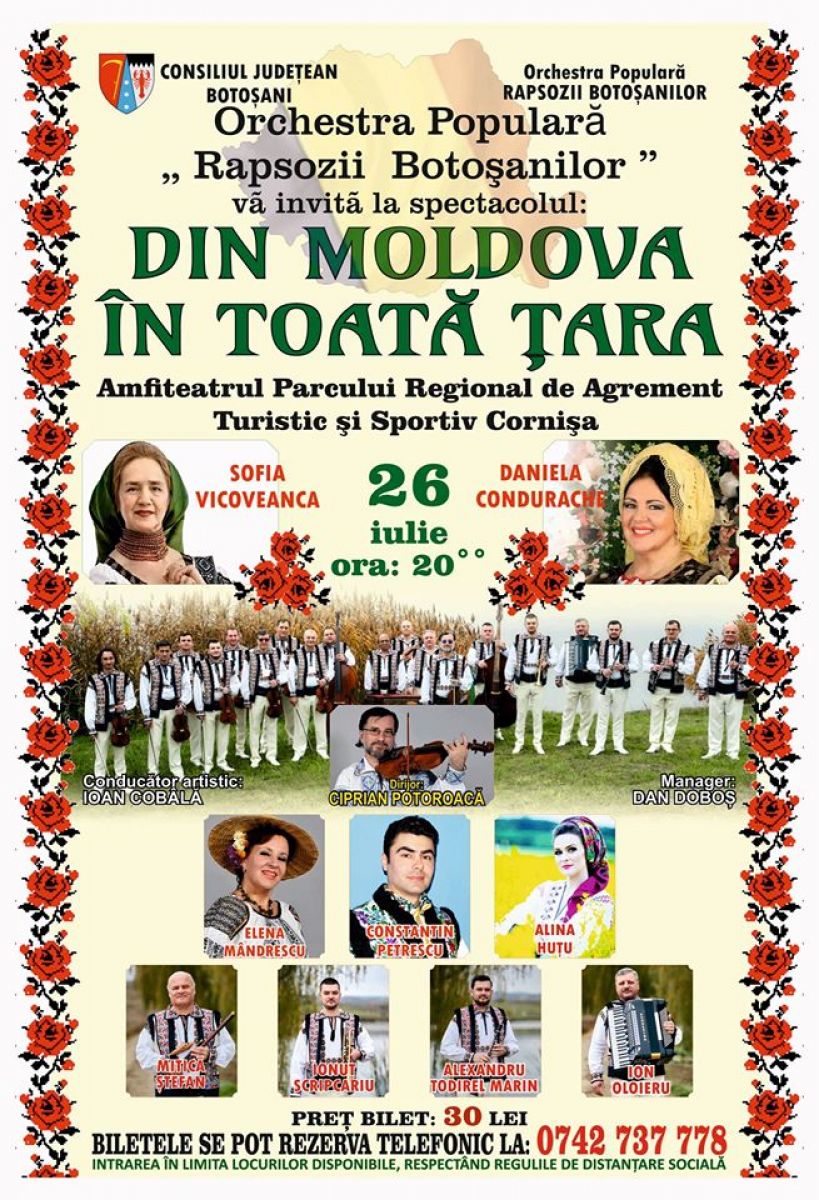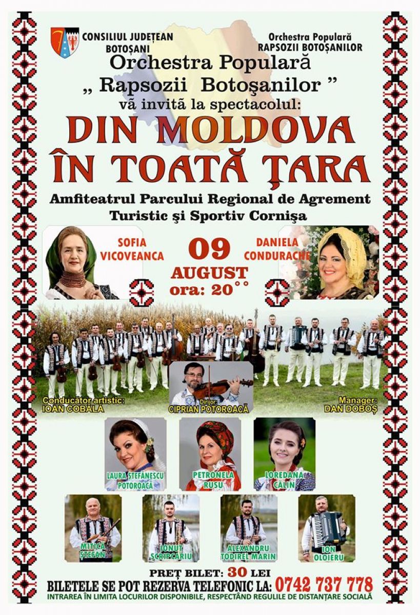 Iubitorii de folclor sunt invitați la spectacolul „Din Moldova în toată ţara”, organizat de Orchestra populară ”Rapsozii Botoșanilor”.