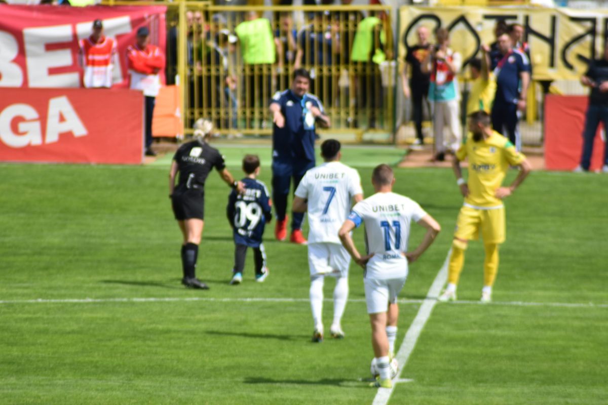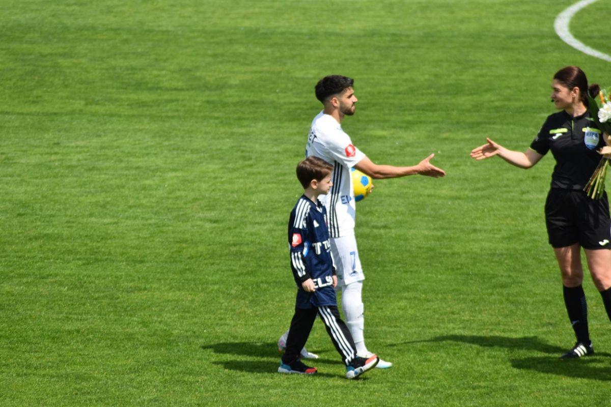 Îmbrăcat cu un tricou al echipei în varianta bleumarin, Rareș Prisacariu a fost asistat îndeaproape de căpitanul Mihai Roman și arbitrul de centru, Alina Peșu.