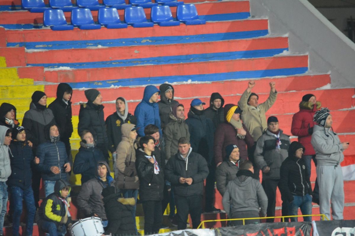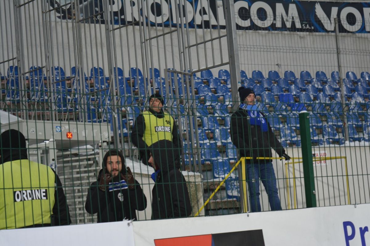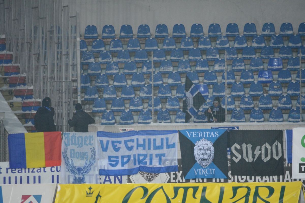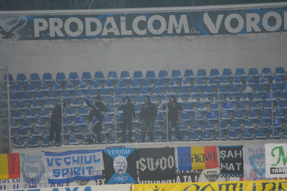 Oltenii au avut cinci suporteri, care s-au încumetat să traverseze ţara de la sud-vest la nord-est pentru a fi alături de formaţia lor de suflet şi care au stat cu ochii pe bannerele de pe gard ca pe butelie să nu le fie furate.