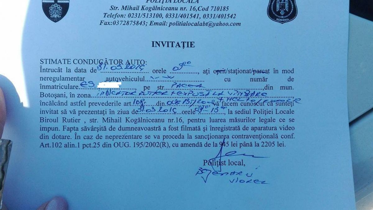 ”Fapta săvârșită de dv. a fost filmată și înregistrată de aparatura video din dotare. În caz de neprezentare se va proceda la sancționarea contravențională conform legii cu amendă între 945 și 2.205 lei”, era scris în invitația la Poliție.
