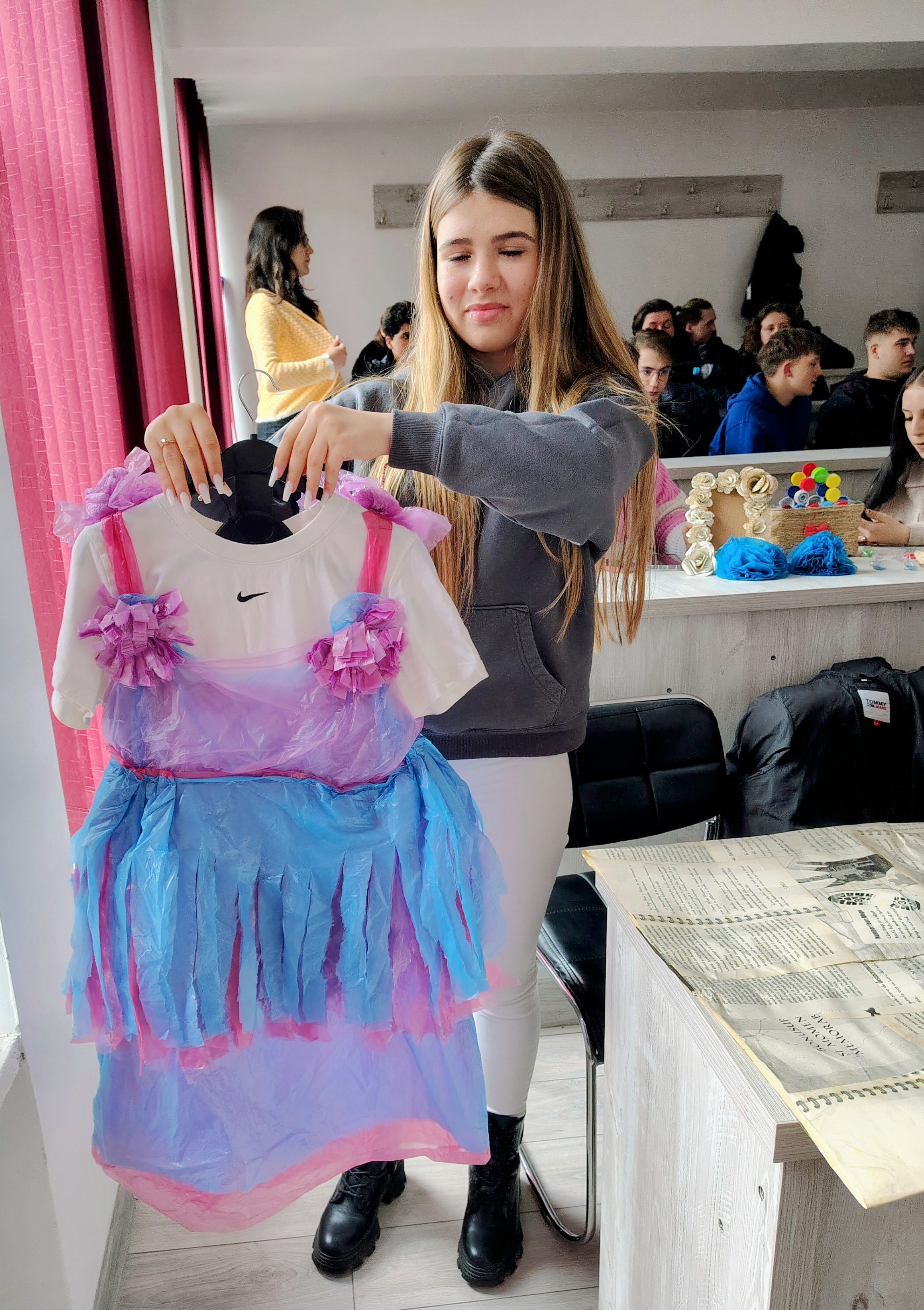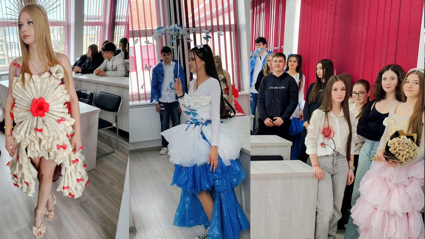 Rochițe diafane garnisite cu panglici din polietilenă reciclabilă, sacouri moderne inscripționate, confecționate din plastic reutilizabil, sarafane cu croială îndrăzneață și umbreluțe vaporoase cu fluturași colorați, atent lucrați – acestea sunt doar câteva dintre creațiile prezentate joi, 10 aprilie, în cadrul paradei de modă „Reciclează cu stil", organizată la Colegiul Economic „Octav Onicescu" din Botoșani.