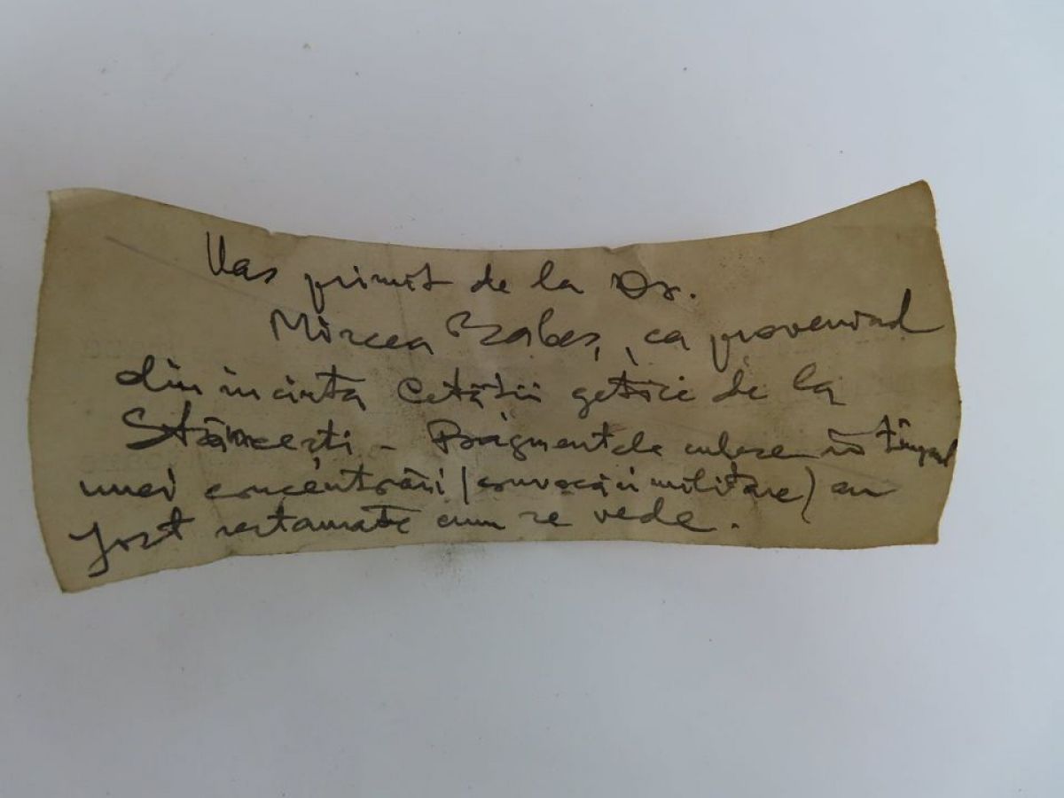 ”În interiorul vasului se afla biletul scris de către arheologul botoşănean Paul Şadurschi”, precizează reprezentanții Muzeului Județean Botoșani.