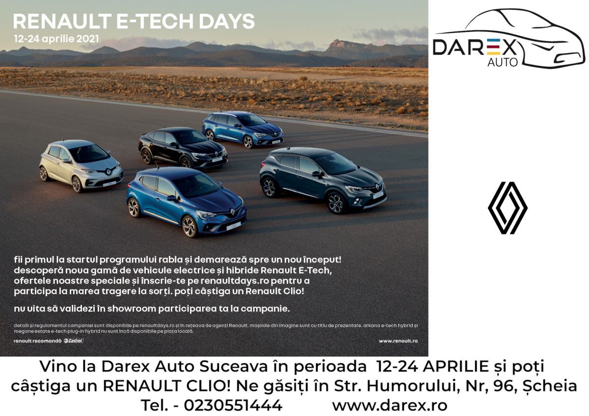 (P) În perioada 12-24 aprilie are loc la nivel național campania Renault E-TECH Days, un eveniment care te invită să descoperi cele mai bune oferte disponibile prin Programul Rabla 2021 și gama de modele electrice și hibride ce poartă semnătura Renault.