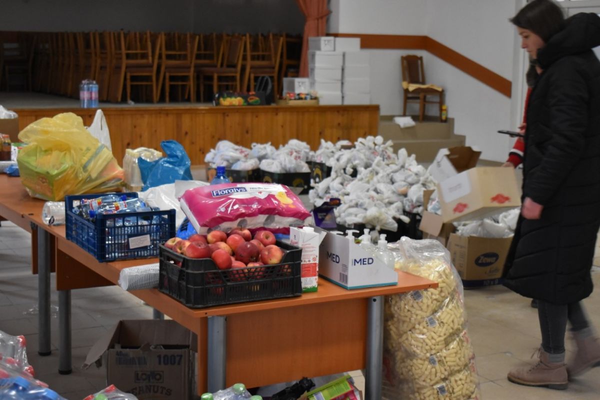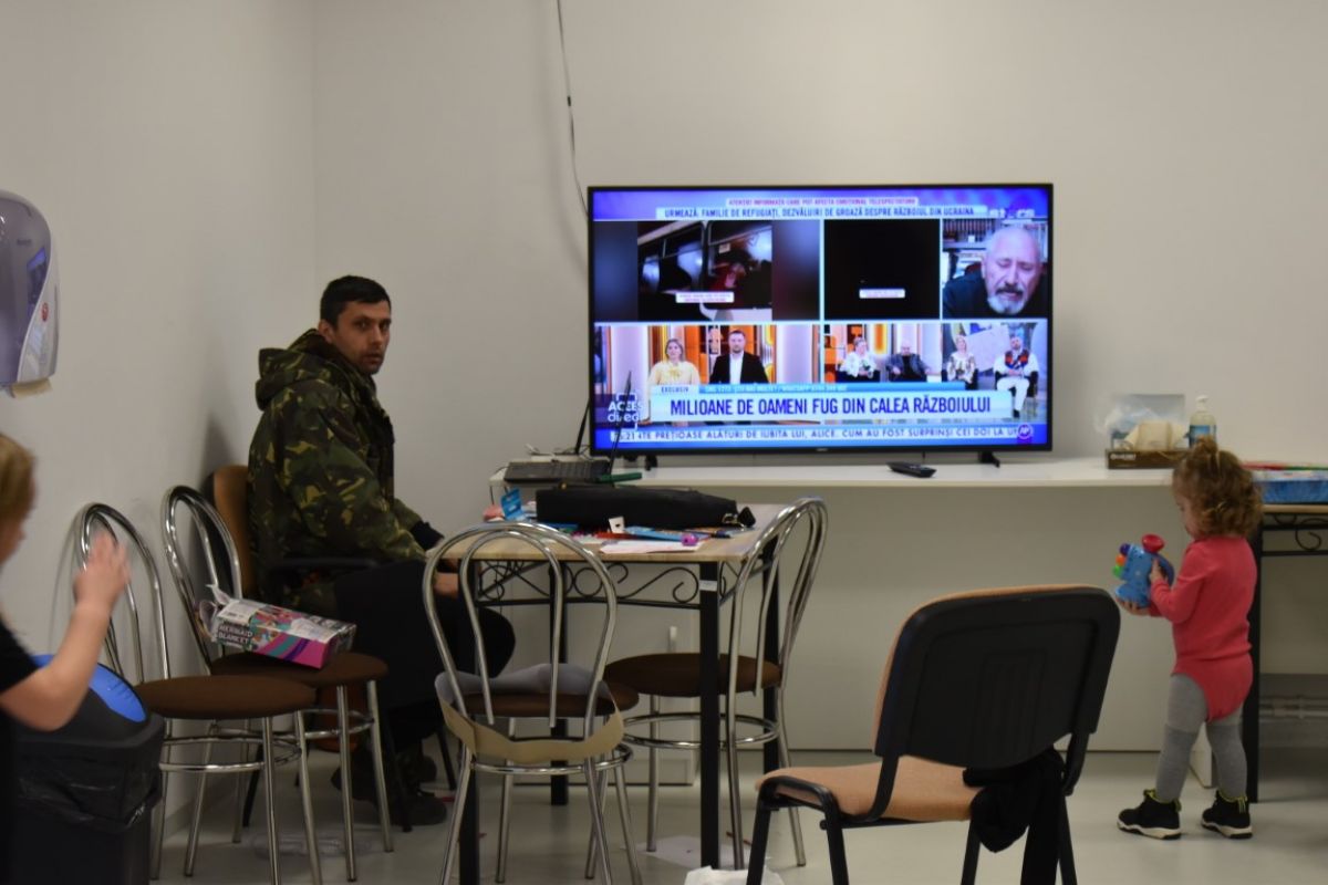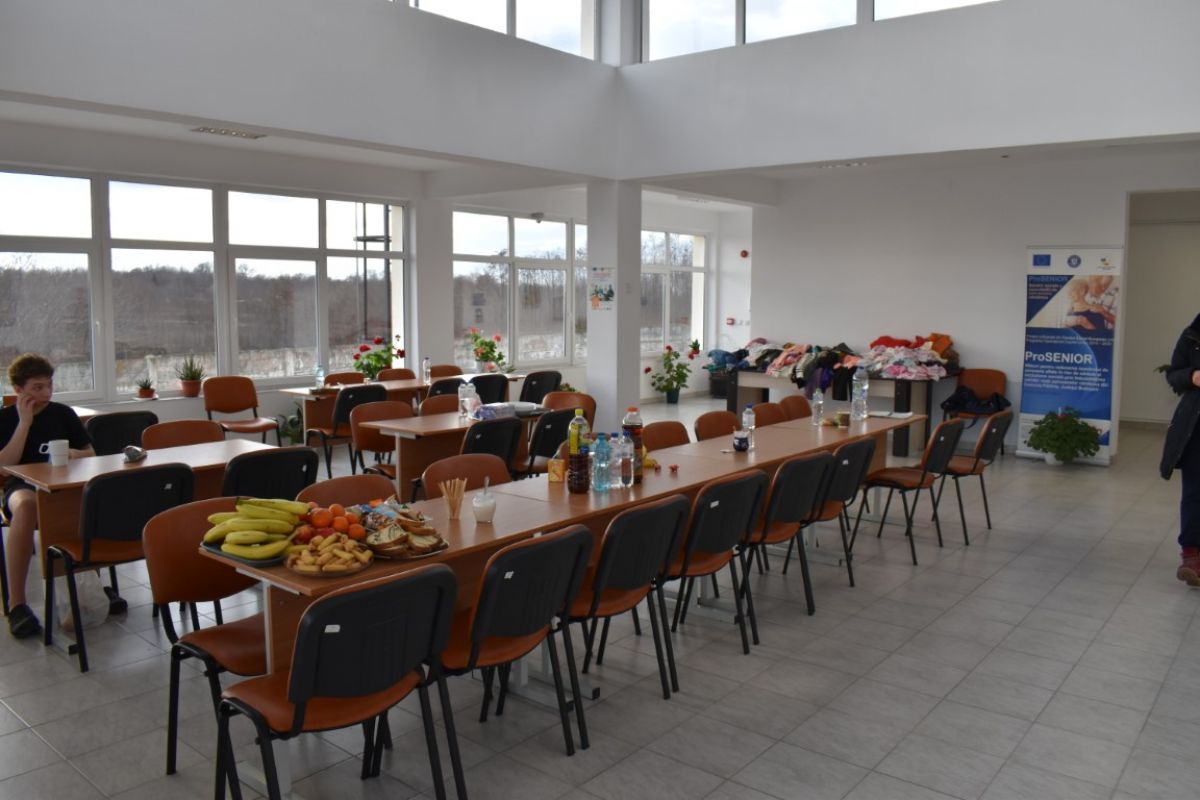 120 de locuri sunt disponibile în centru pentru ucraineni. Peste tot sunt alimente, produse de igienă, apă, fructe, haine și încălțăminte donate de civili.