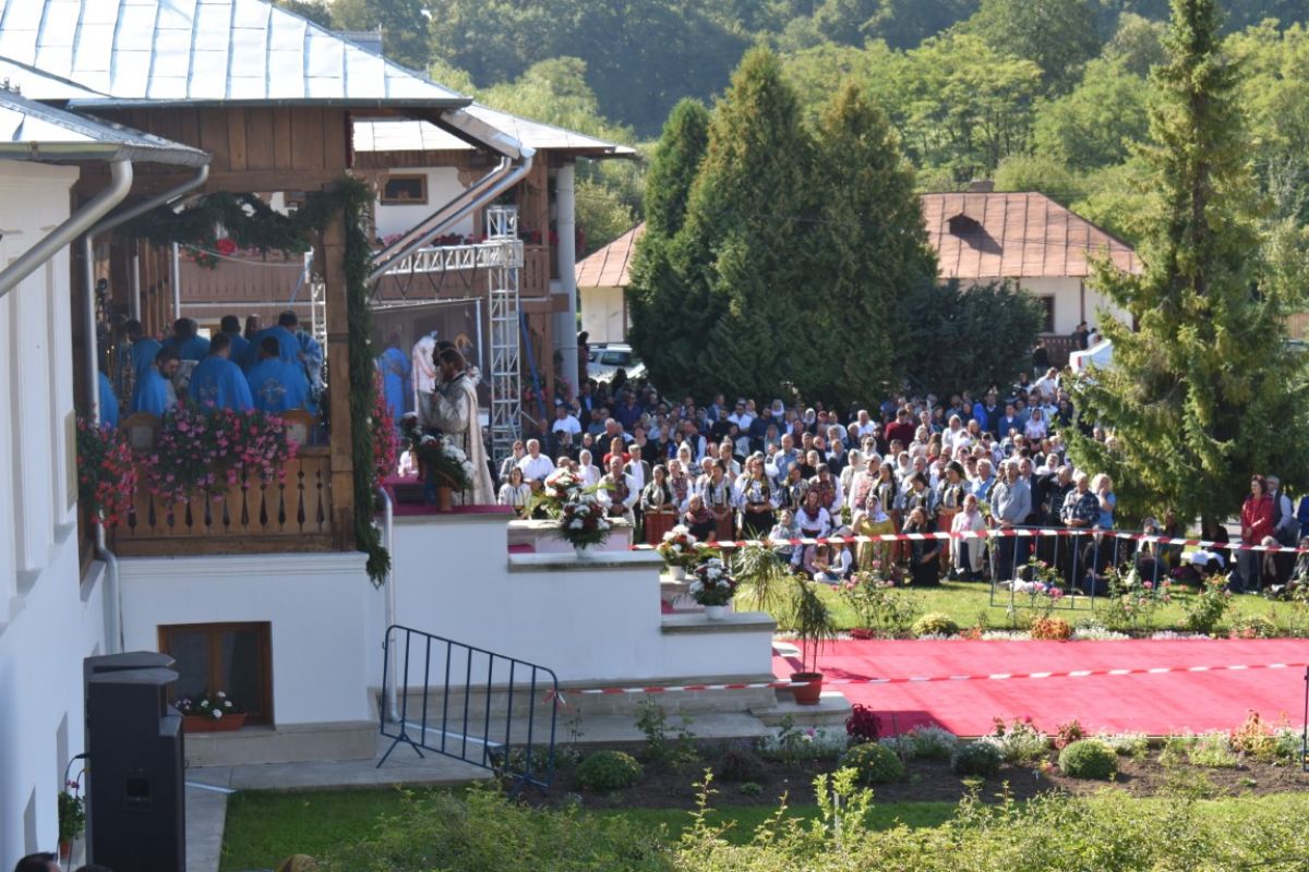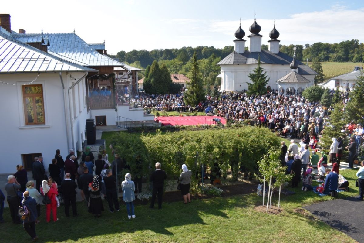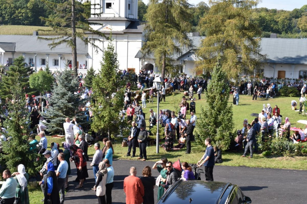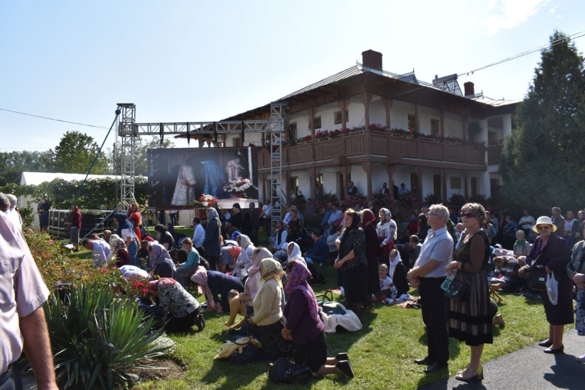 În interior, o mare de credincioși era răsfirată pe iarba din curtea Mănăstirii. Îmbrăcați în straie populare mulți dintre ei, cu copii în brațe sau lăsați să se joace pe pături. Oameni cu capul plecat într-o rugăciune tăcută sau în genunchi, atenți la slujba oficiată sus pe treptele clădirii principale.