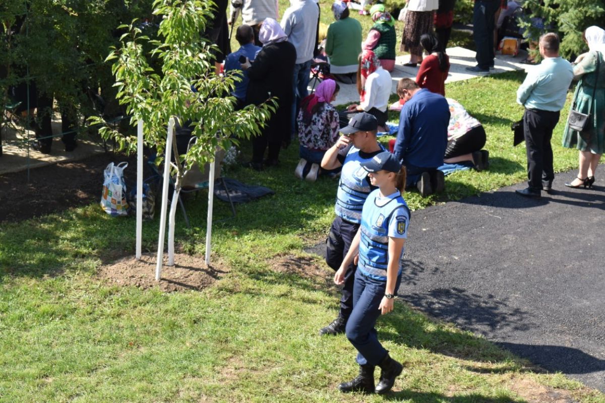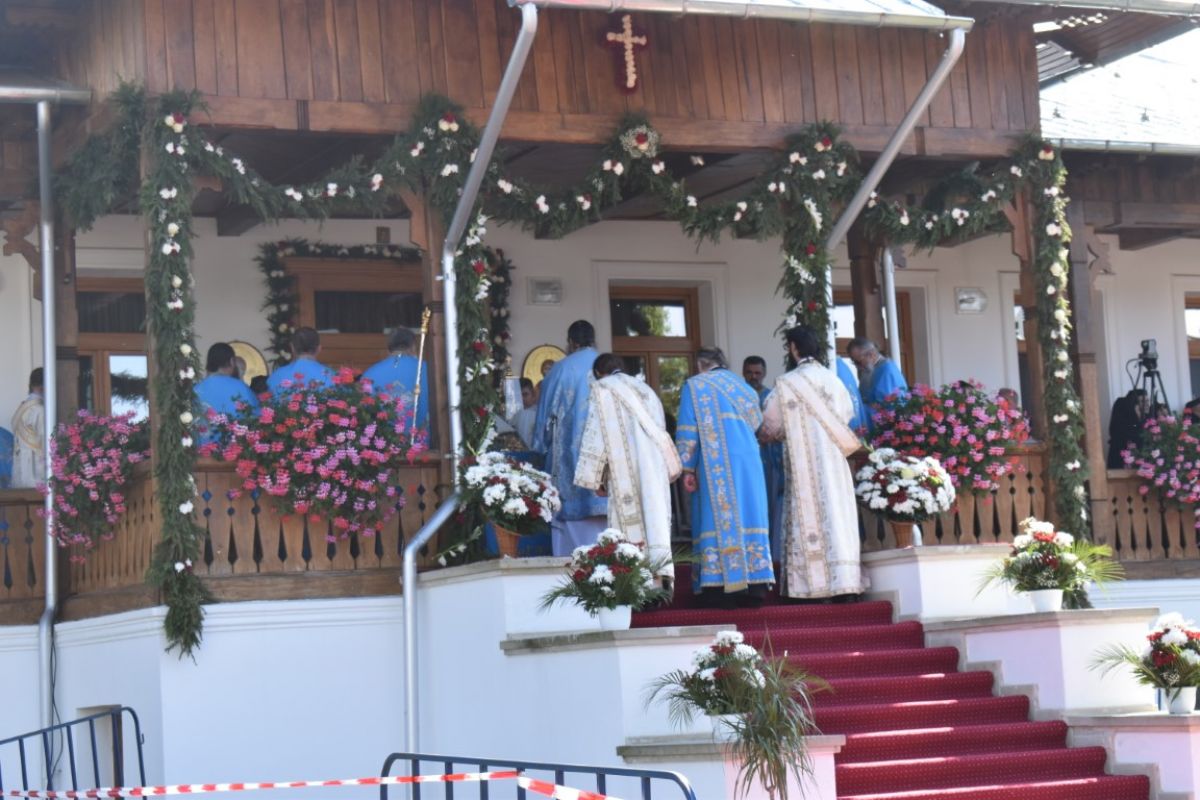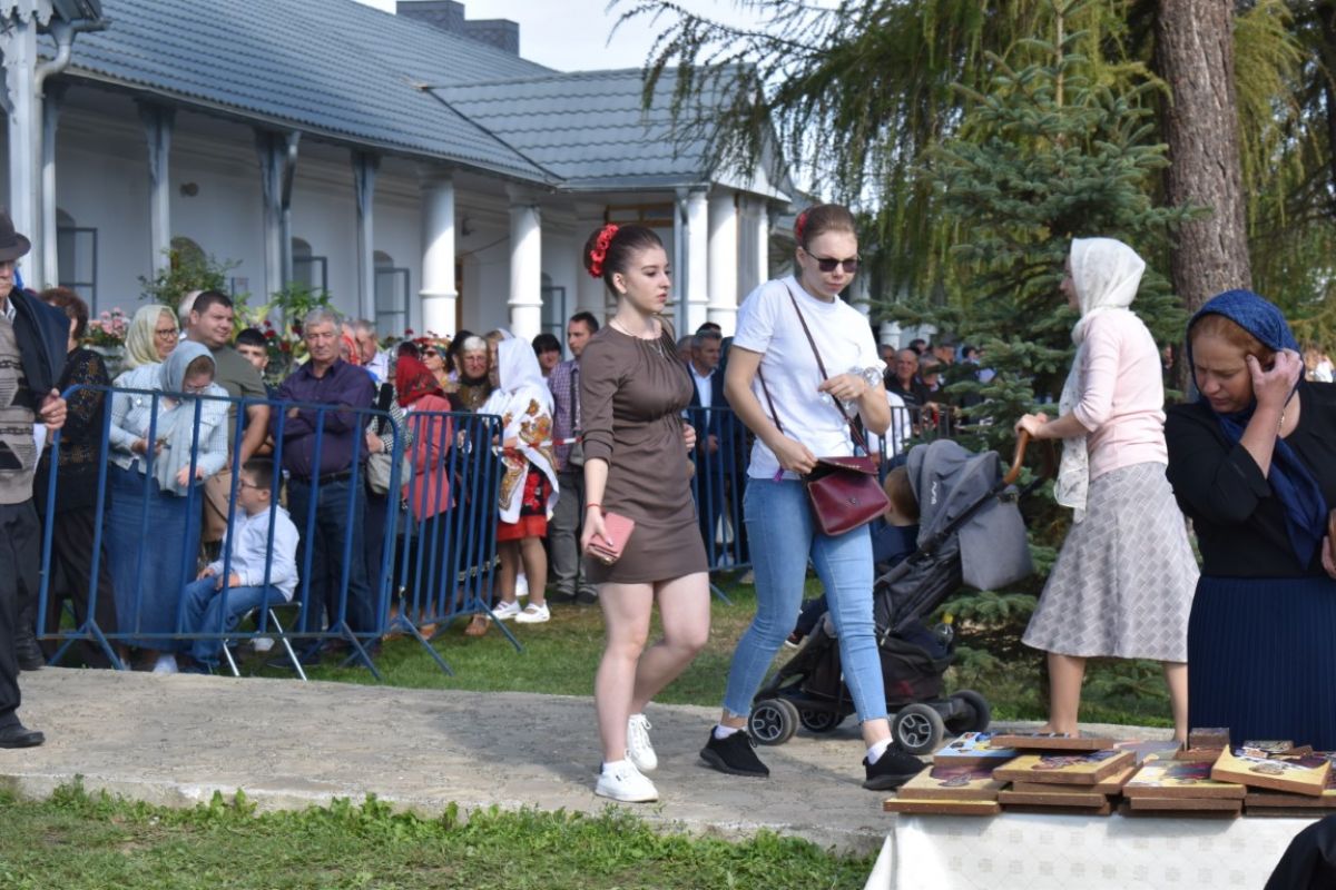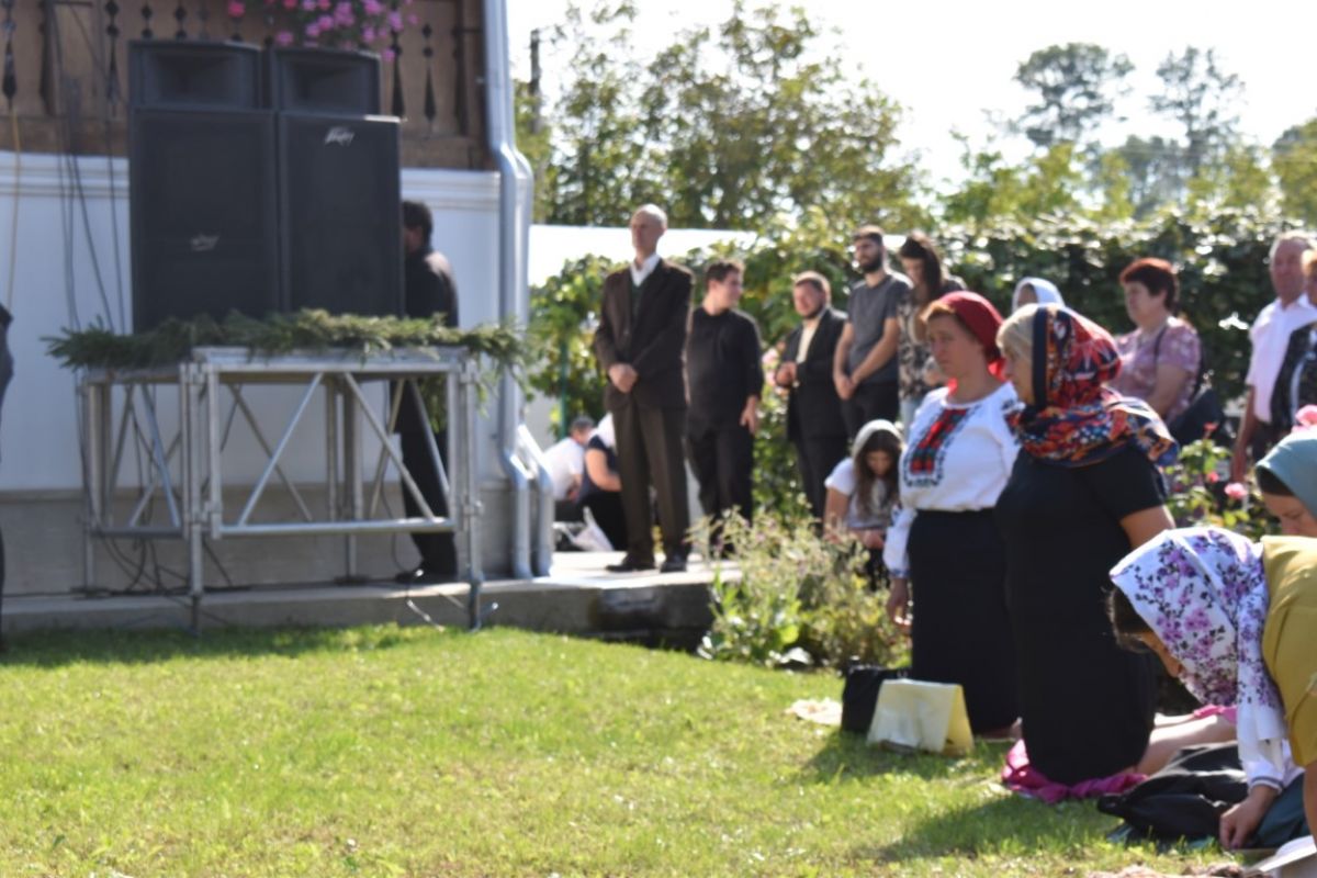 În interior, o mare de credincioși era răsfirată pe iarba din curtea Mănăstirii. Îmbrăcați în straie populare mulți dintre ei, cu copii în brațe sau lăsați să se joace pe pături. Oameni cu capul plecat într-o rugăciune tăcută sau în genunchi, atenți la slujba oficiată sus pe treptele clădirii principale.