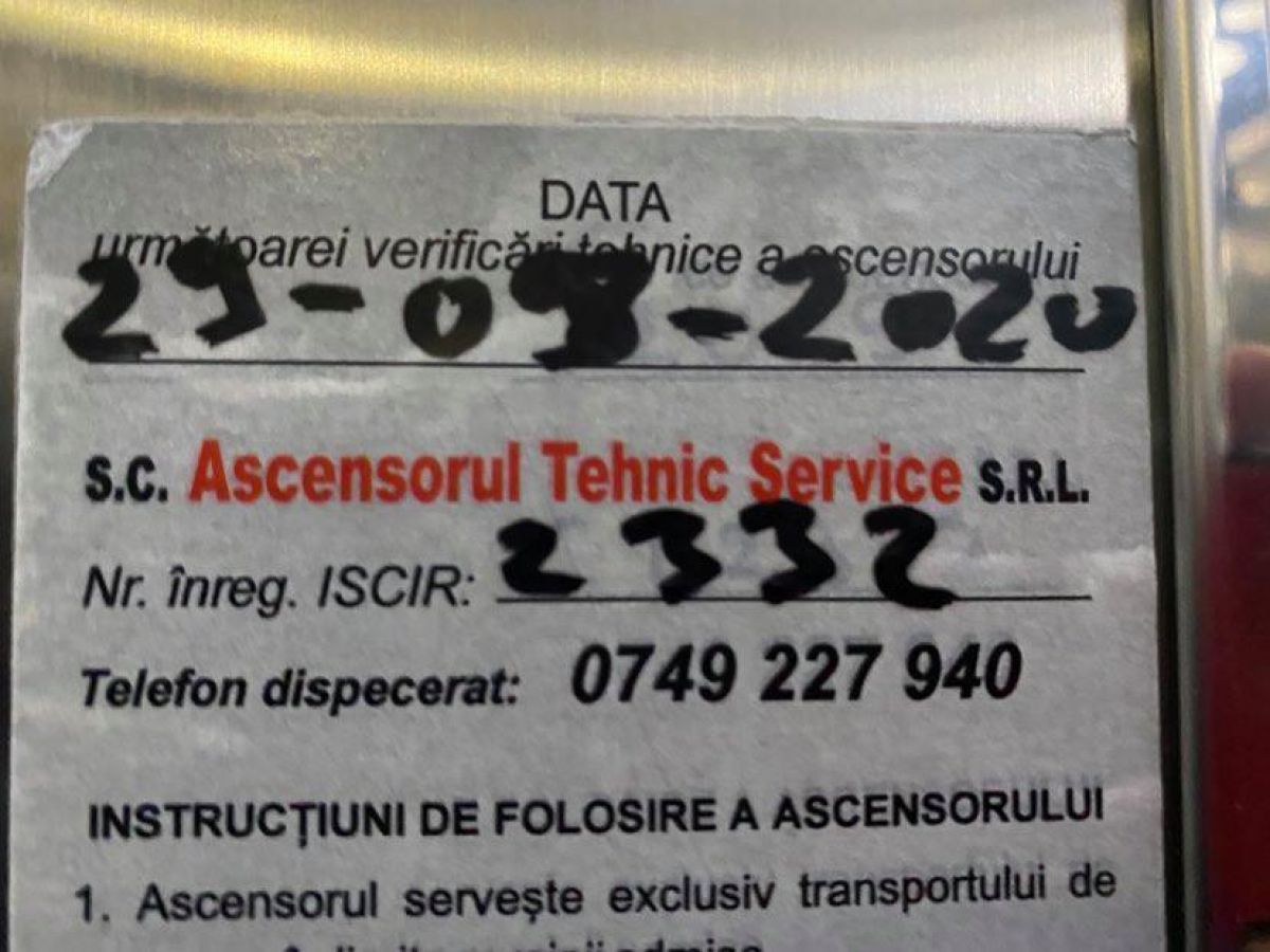 Lângă ușa liftului scrie negru pe alb că, ”pentru prevenirea răspândirii Covid în ascensor vor urca doar membri din aceeași familie”.