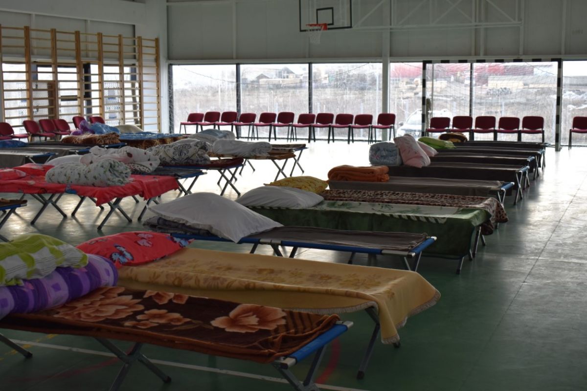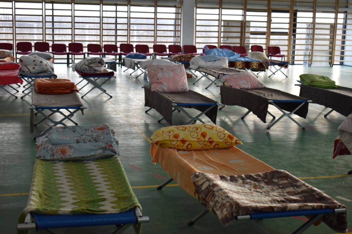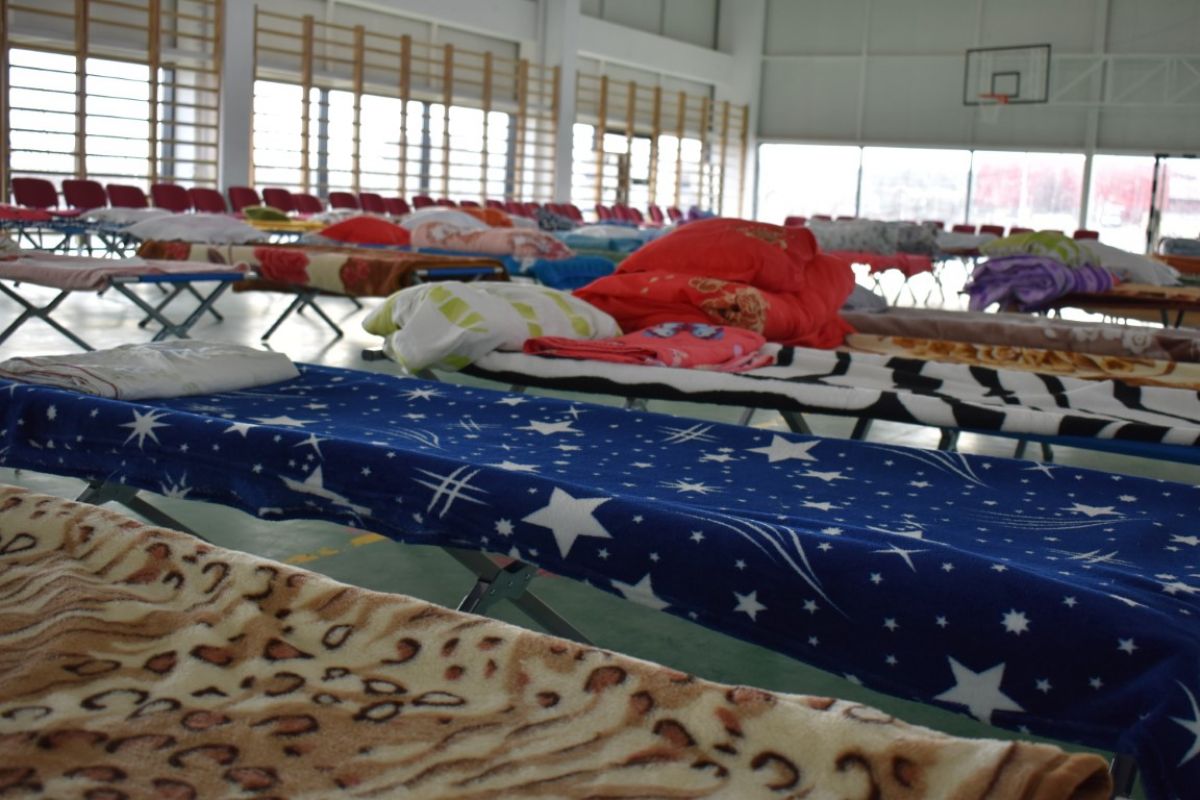 O imensă sală de sport unde au fost aliniate zeci de paturi. E cald în interior, atmosfera este cât de cât primitoare. Pe partea dreaptă, la perete, au fost aliniate mese pe care se află apă, ceai, cafea și tot felul de gustări.