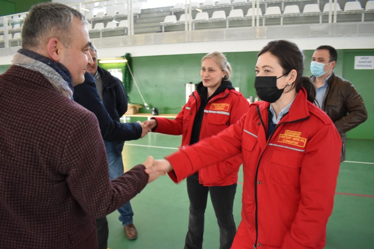 Prefectul Sorin Cornilă se interesează de starea de sănătate a refugiaților: „o să avem după-amiaza aceasta un medic care va veni să facă o evaluare medicală aici, în punctul acesta. Unde a fost centrul de vaccinare. Dar acum gata. Aici o să stea un medic să facă o evaluare”.