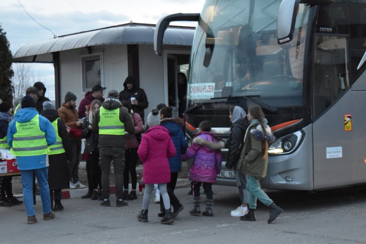 Un autocar înțesat cu refugiați ajunge pe teritoriul românesc. Coboară multe femei și copii, voluntarii îi înconjoară și îi întreabă de necesități. Primesc cartele telefonice, ceai cald și cafea. Produse de igienă, pampers de toate mărimile, mâncare pentru copii mici. Cineva aduce mici cu pâine și muștar. Se formează coadă și refugiații mânâncă tăcuți.
